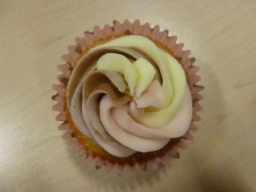 I did the icing in a similar way – three piping bags inside one big one with a nozzle. I should have added more milk to the icing to make them softer and easier to pipe. It was very hard to pipe the first few cupcakes but as soon as I’d got half way through they were really easy. So next time I’d also only half fill the bags and do it in two lots – it makes it much easier to hold and squeeze the piping bag!