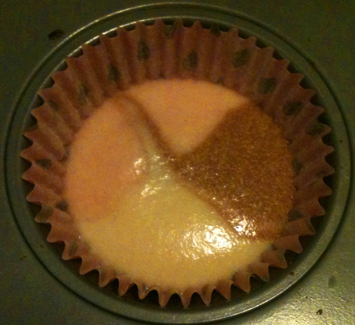 Take all three piping bags and place inside a forth piping bag. Cut the ends off so there is a fairly large opening and piping the mixture into the muffin cases until 2/3rds full.