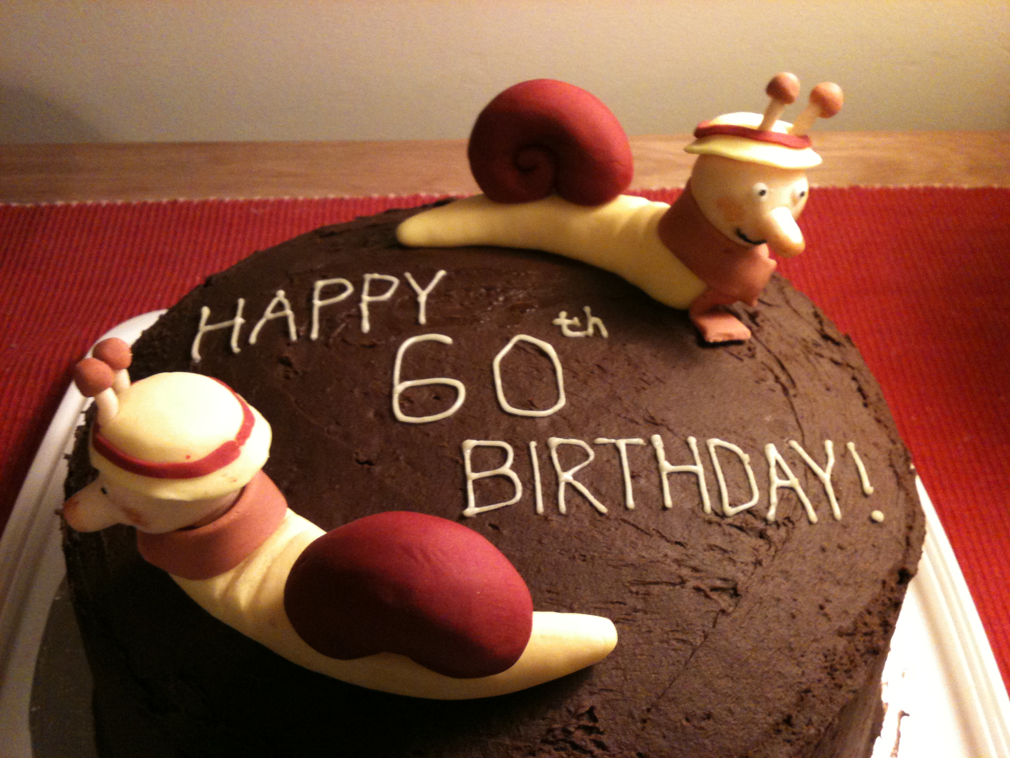 I had great fun making this chocolate cake topped with Brian the Snail (from the Magic Roundabout) for Jen’s dad’s 60th birthday in March.