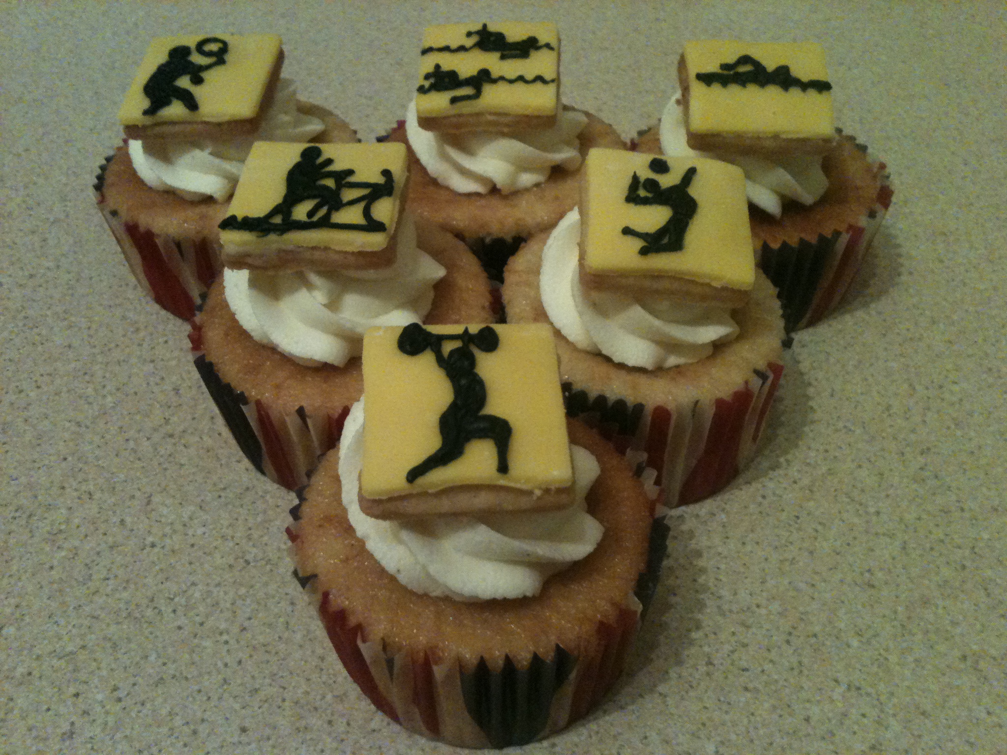 July saw the start of the Olympics so I took the opportunity to make some Olympic cupcakes for the office. I copied the symbols for each sport off the BBC website to ice some biscuits to go on top of cupcakes to represent the various Olympic sports.