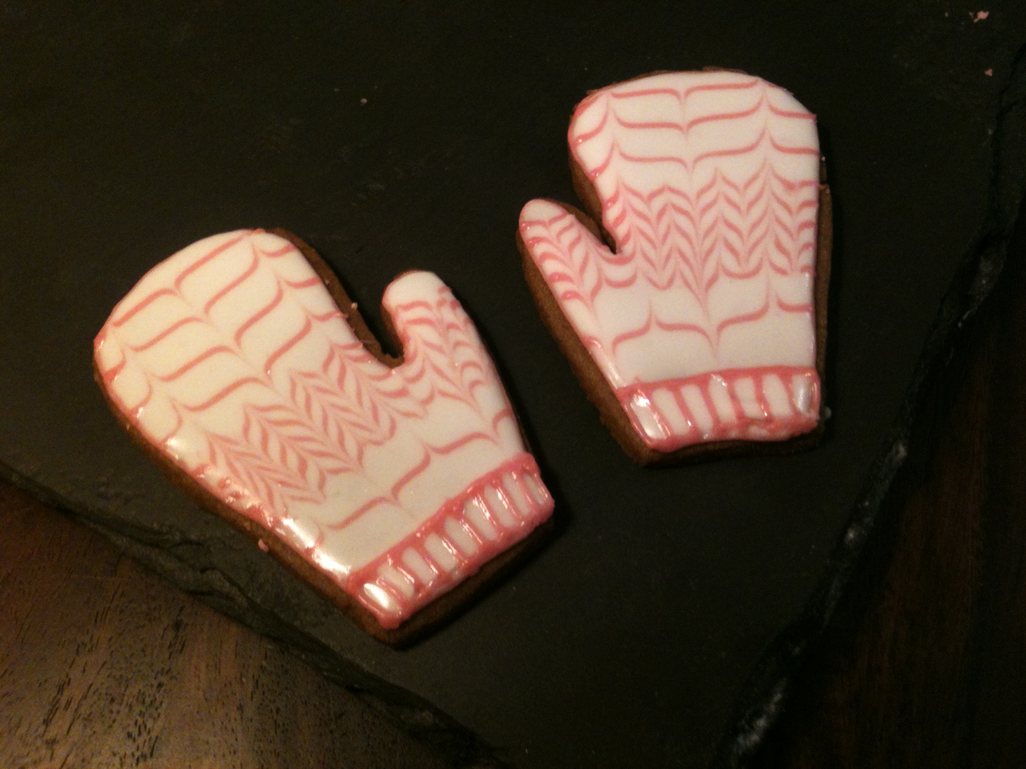 The mittens were decorated with royal icing – I filled a piping bag with pink icing and a Wilton no. 1 nozzle and piped an outline round each mitten. I then flooded the inside of each one with slightly runnier white royal icing. Using the piping bag with pink icing in, I piped lines across each mitten at various widths. Then, using a cocktail stick I dragged it all the way down the middle of the cookie, then moved along a bit and dragged it up, then down etc to create the pattern you can see on them. I finished each one off by piping some stripes at the bottom of the mitten.