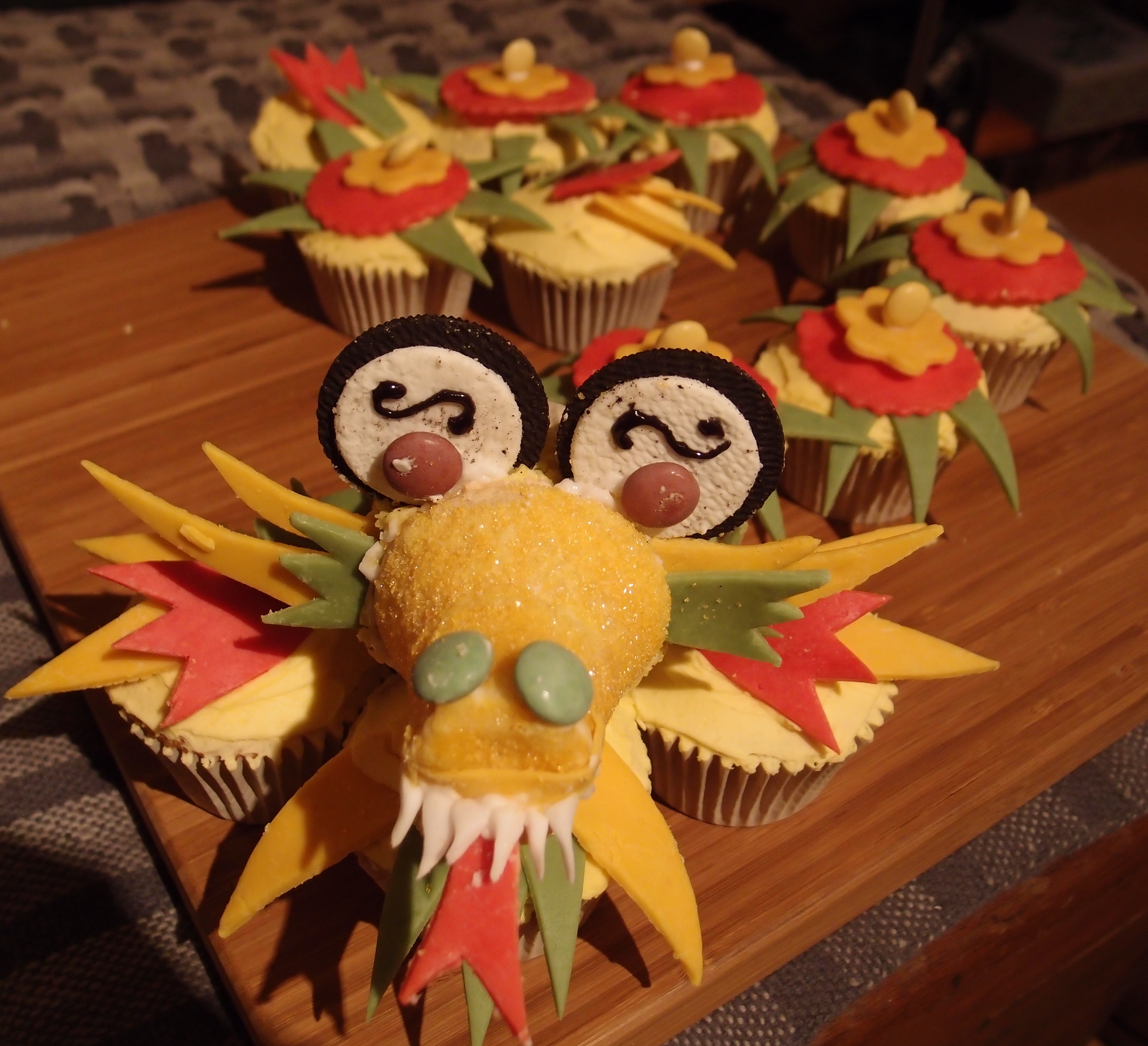 Last Christmas Tom gave me some great presents. One of them was a “Hello Cupcake” calendar. I have the Hello, Cupcake! and What’s New Cupcake? books and I love the fun ideas in them…. and the calendar has 12 new ideas for me to try! So I have decided that each month I will make the cupcakes for that month. January’s cupcakes were shoes, which I’d already made in December (got a bit ahead of myself there – maybe I’m psychic?!) so the first ones to make were the ones for February. Could you eat a dragon?