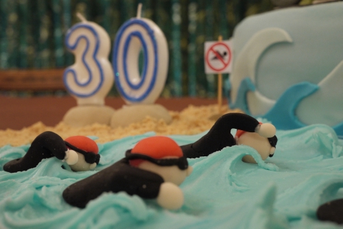 These little swimmers were my favourite part of the cake. The other people were ok, but I made the mistake of making them before I started assembling the cake and they turned out to be too big, so I had to start over again… which meant I made them all twice! By the end I just wanted to give up but I knew that wasn’t an option – if one of the people was missing then it just wouldn’t be right. So Iย persevered and eventually got there.