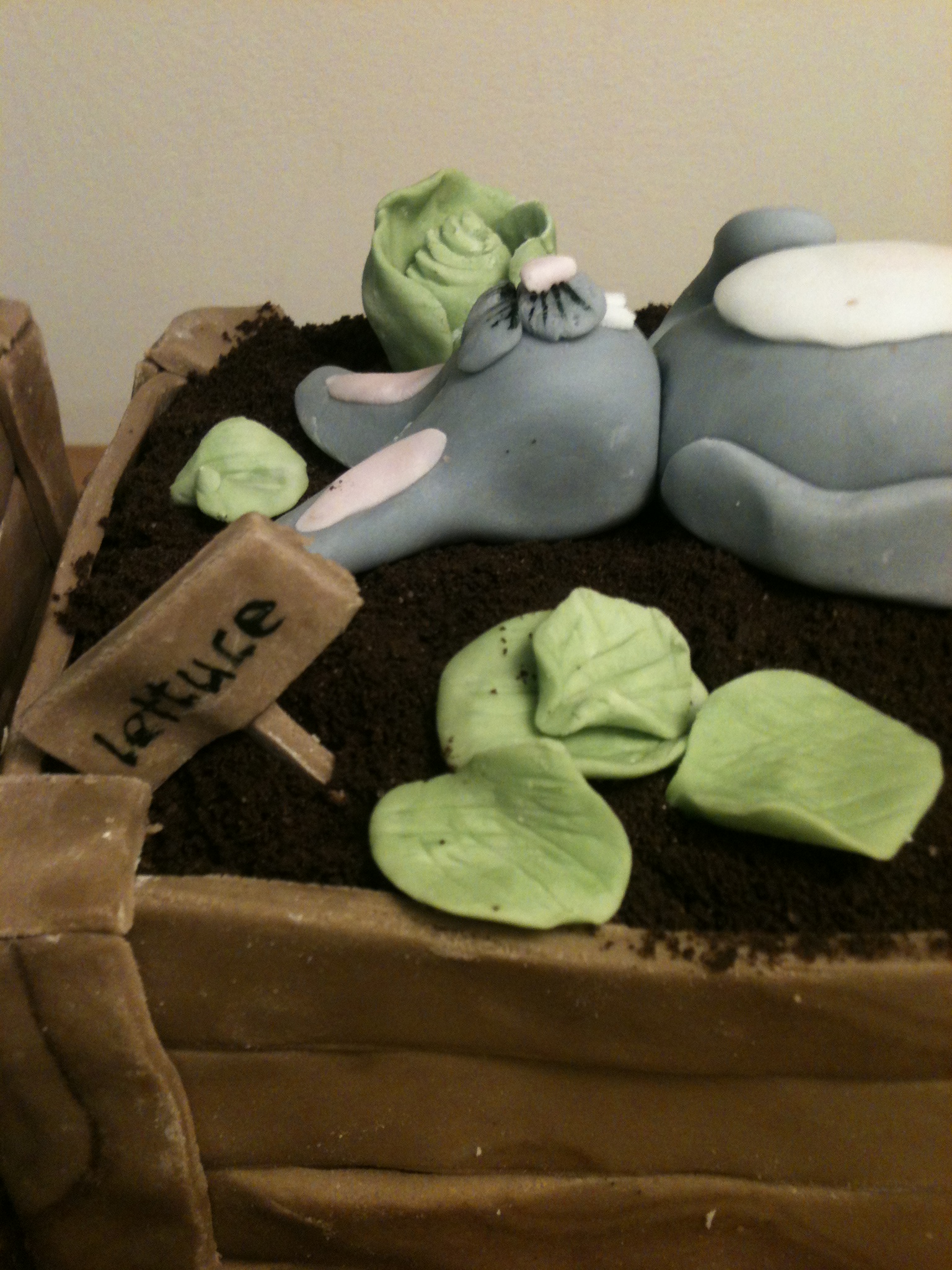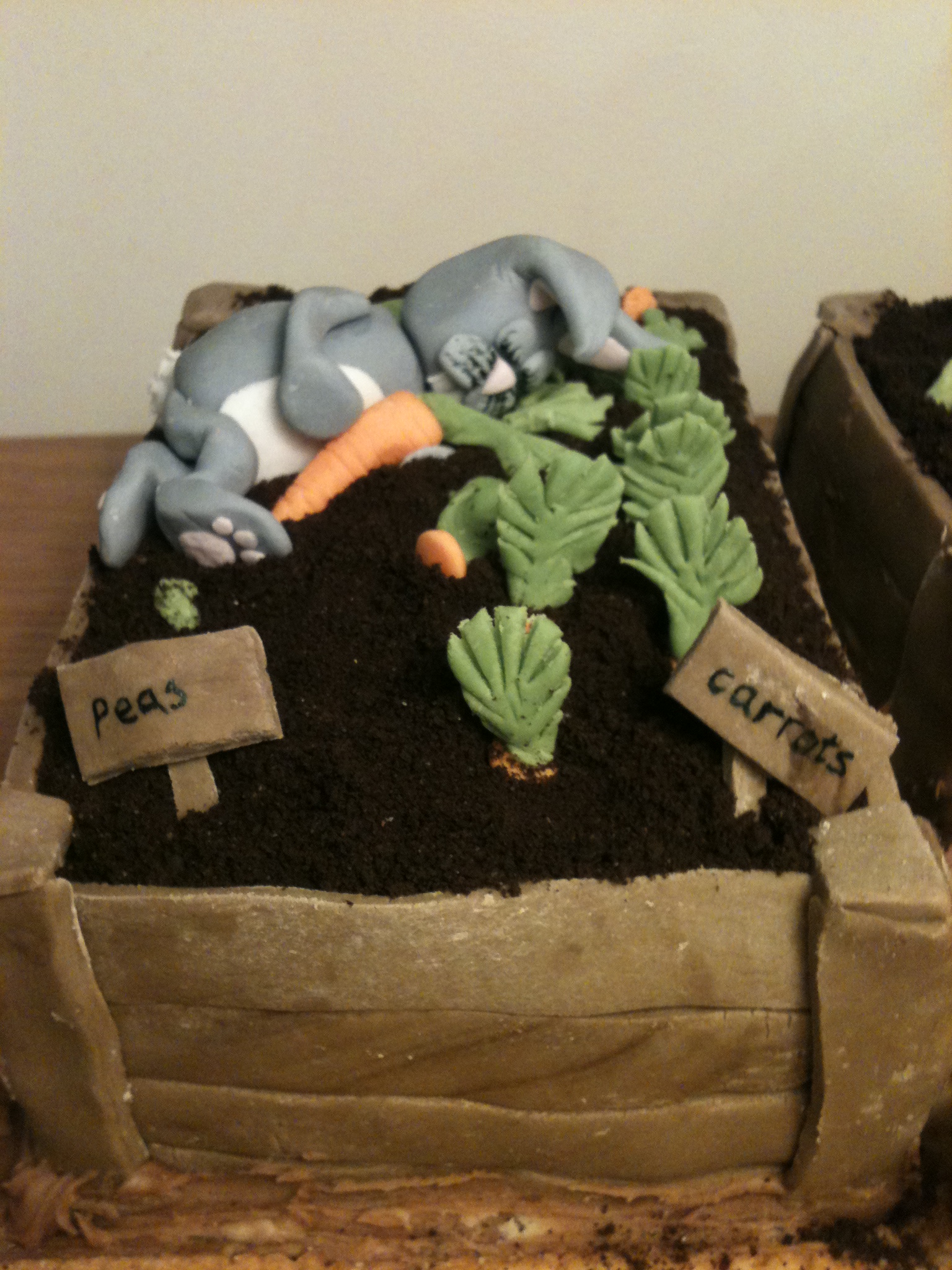 After I made a dinosaur cake for David’s son’s birthday, he asked me if I could make an Easter cake. As soon as he said he wanted a silly (rather than serious) cake, I came up with an idea… I loved the style of the drunk robin cake I made at Christmas and decided to make it Easter themed – so instead of drunk robins on a tree trunk, I wanted to make bunnies who’d eaten too many carrots on a raised vegetable bed. The problem is, now I’ve made it, I want to keep it!