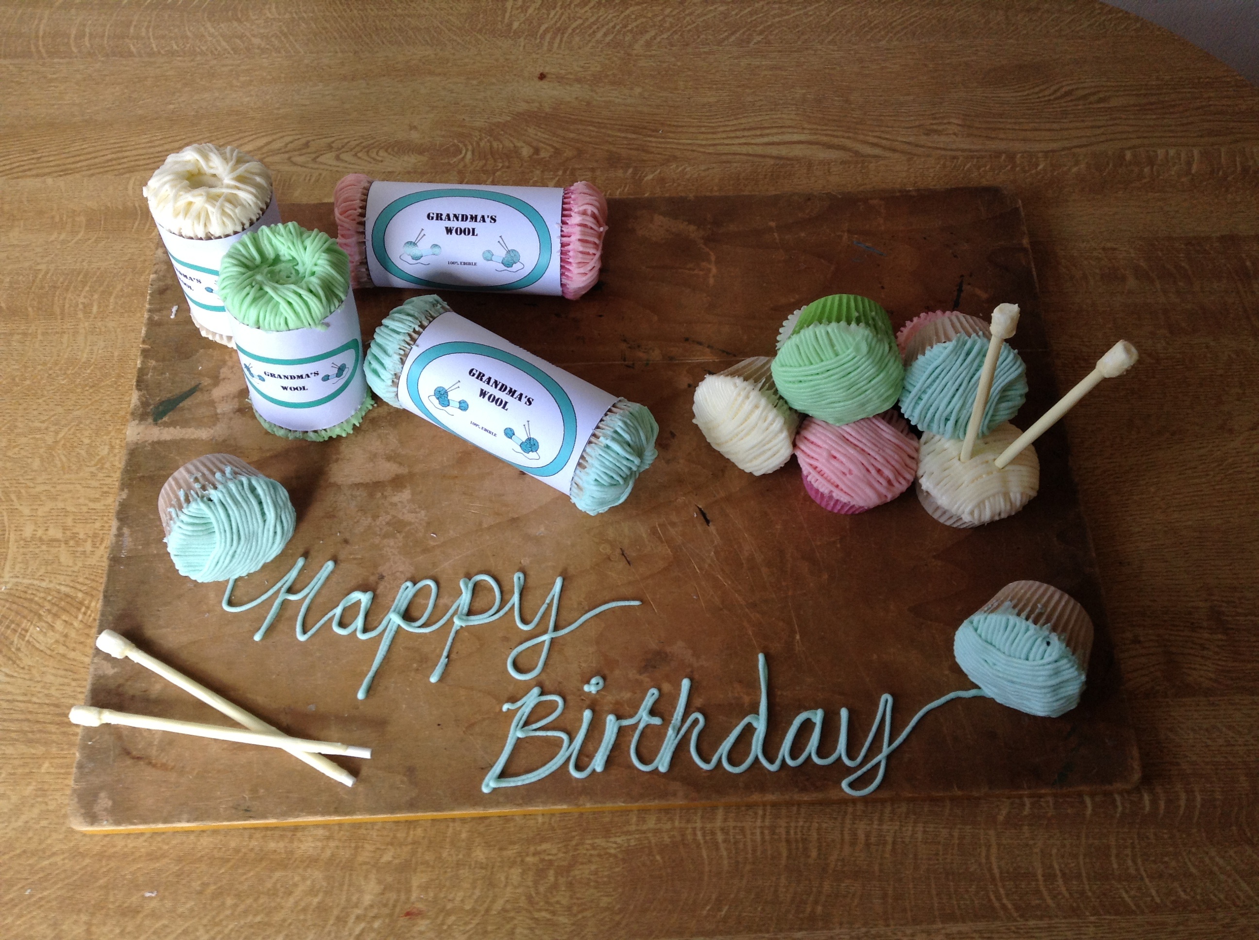 Finally, to finish the board off I used the left over blue icing to pipe “happy birthday” and then to make it look like it was written in wool I placed two of the blue balls of wool next to it.