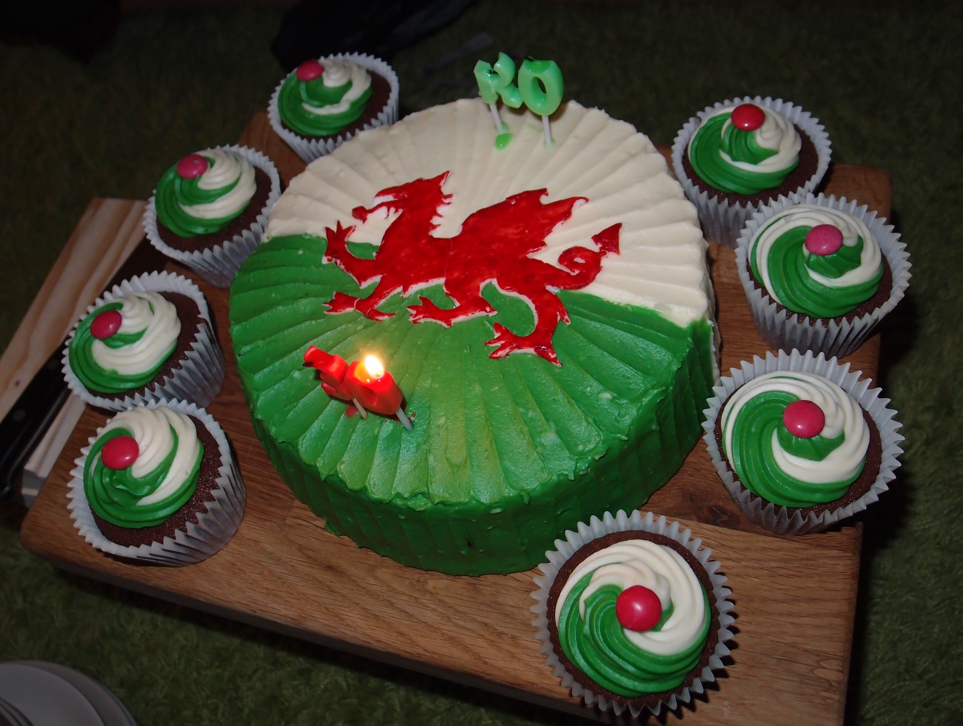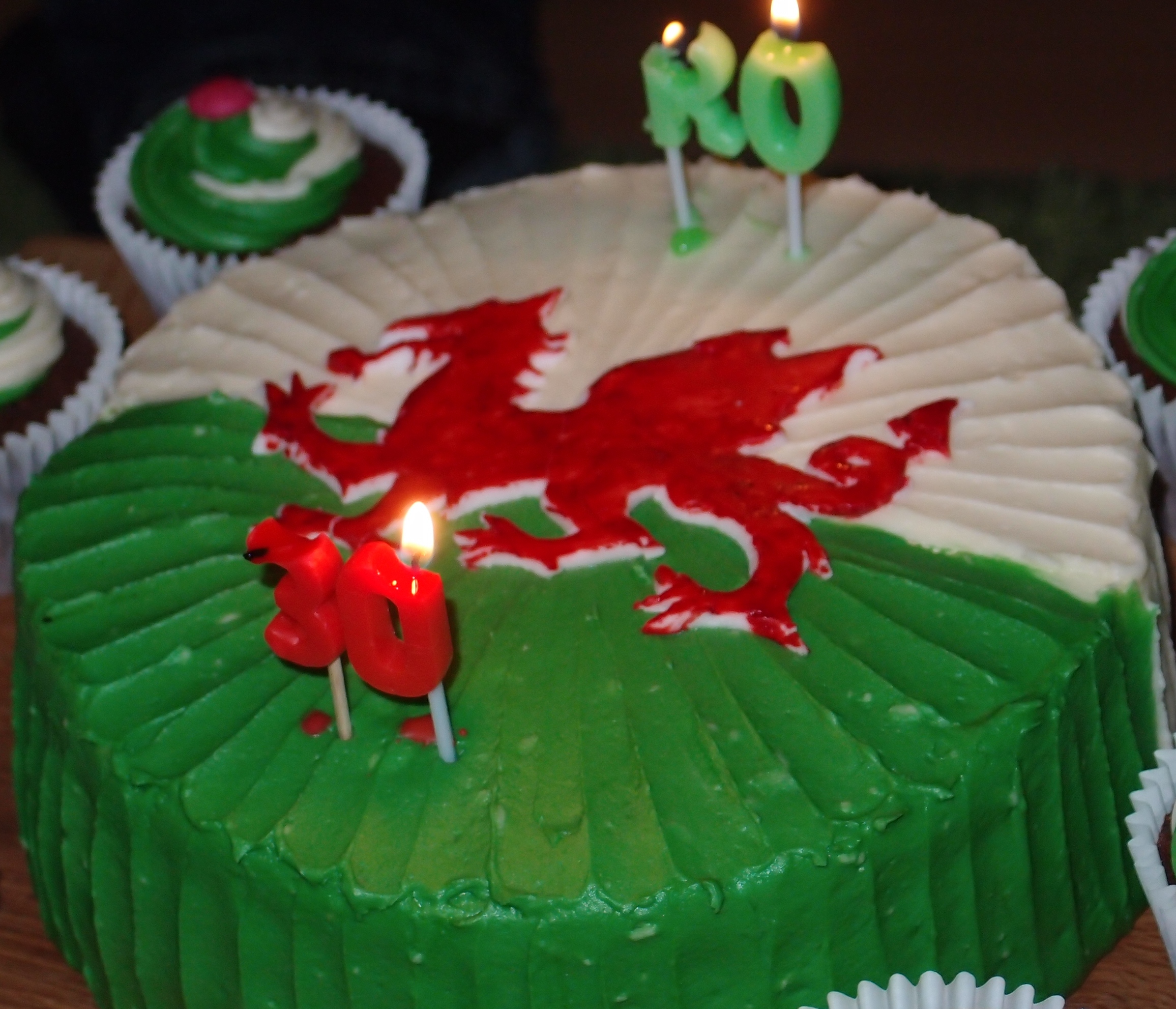 Ro is Welsh so I decided to make her a Welsh flag cake. For the decoration, I rolled out some white fondant icing and cut out a Welsh dragon by hand with a knife and then painted it with red food colouring. It’s probably easy if you’ve got a template or Welsh dragon cookie cutter to cut it out using that but I gave my cutter to my sister so I had to go for the free-style option!
