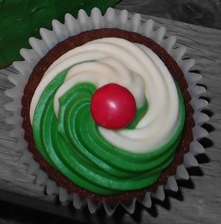 To ice the cupcakes I used a new dual piping bag and nozzle set (from Lakeland) which Father Christmas gave me for Christmas – I filled one half of the bag with white icing and one with green and then piped a swirl on top of each cupcake. I wasn’t going to make mini dragons to go on top of each one so I bought Smarties to go on top… I had to open loads of tubes to get enough red ones! I think I’ll have to find something to do with the other colours before I eat them all….