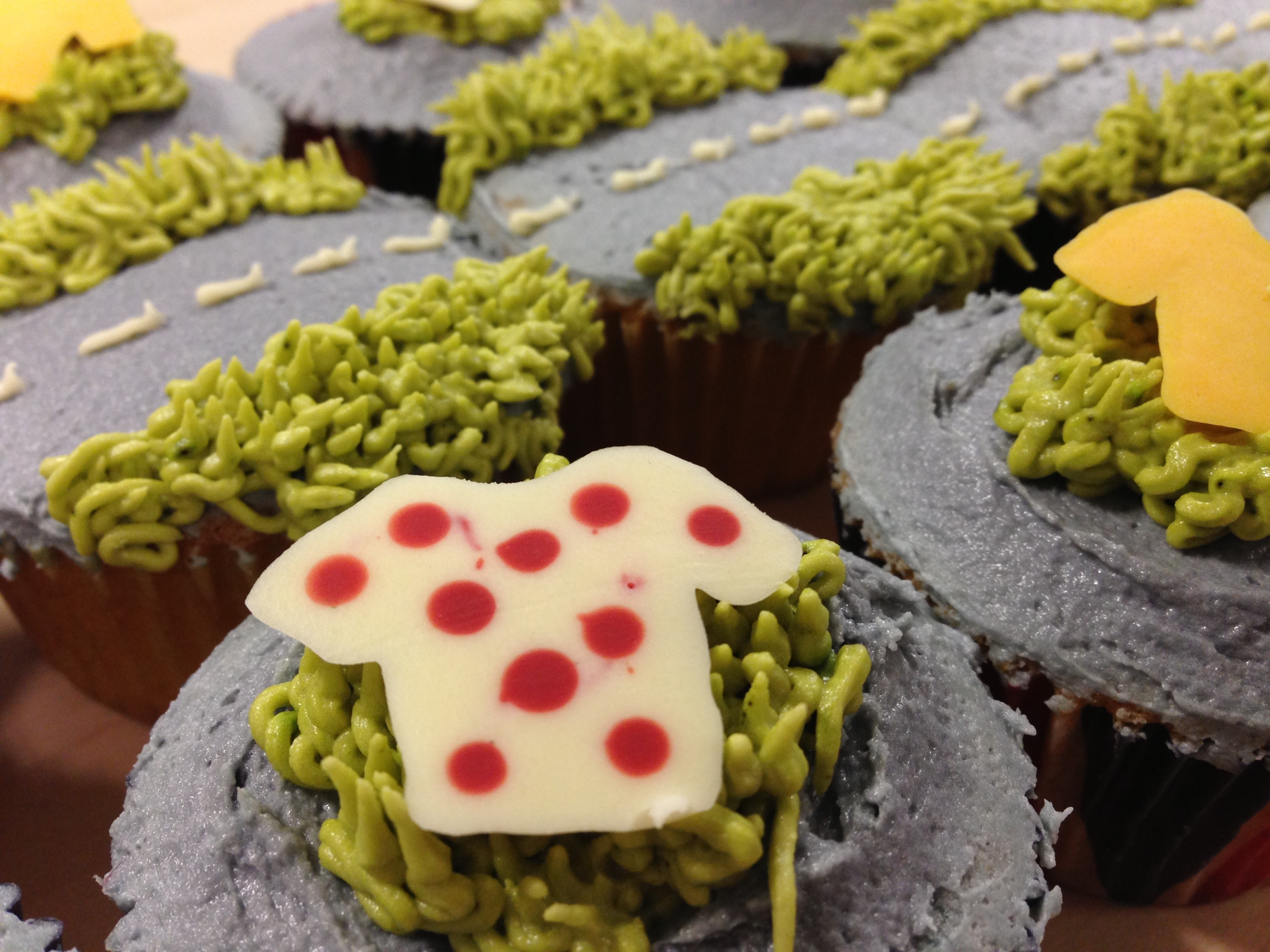 I made the jerseys by piping coloured white chocolate onto greaseproof paper. For the king of the mountains polka dot jerseys, I piped the red dots first and then the white chocolate over the top. After they had set in the fridge, I took them off the paper and placed them on the cupcakes with the side that had been on the greaseproof paper facing upwards.