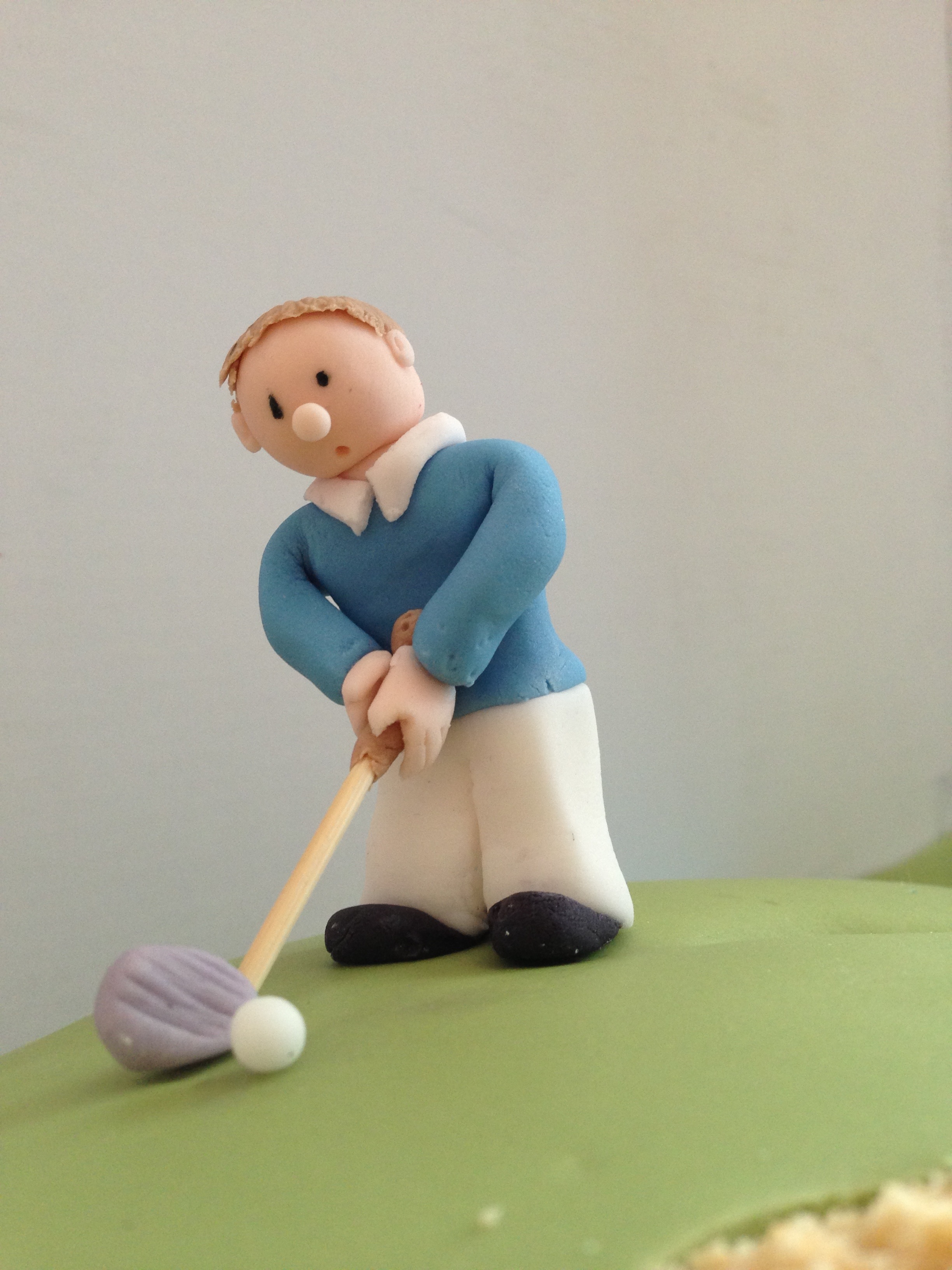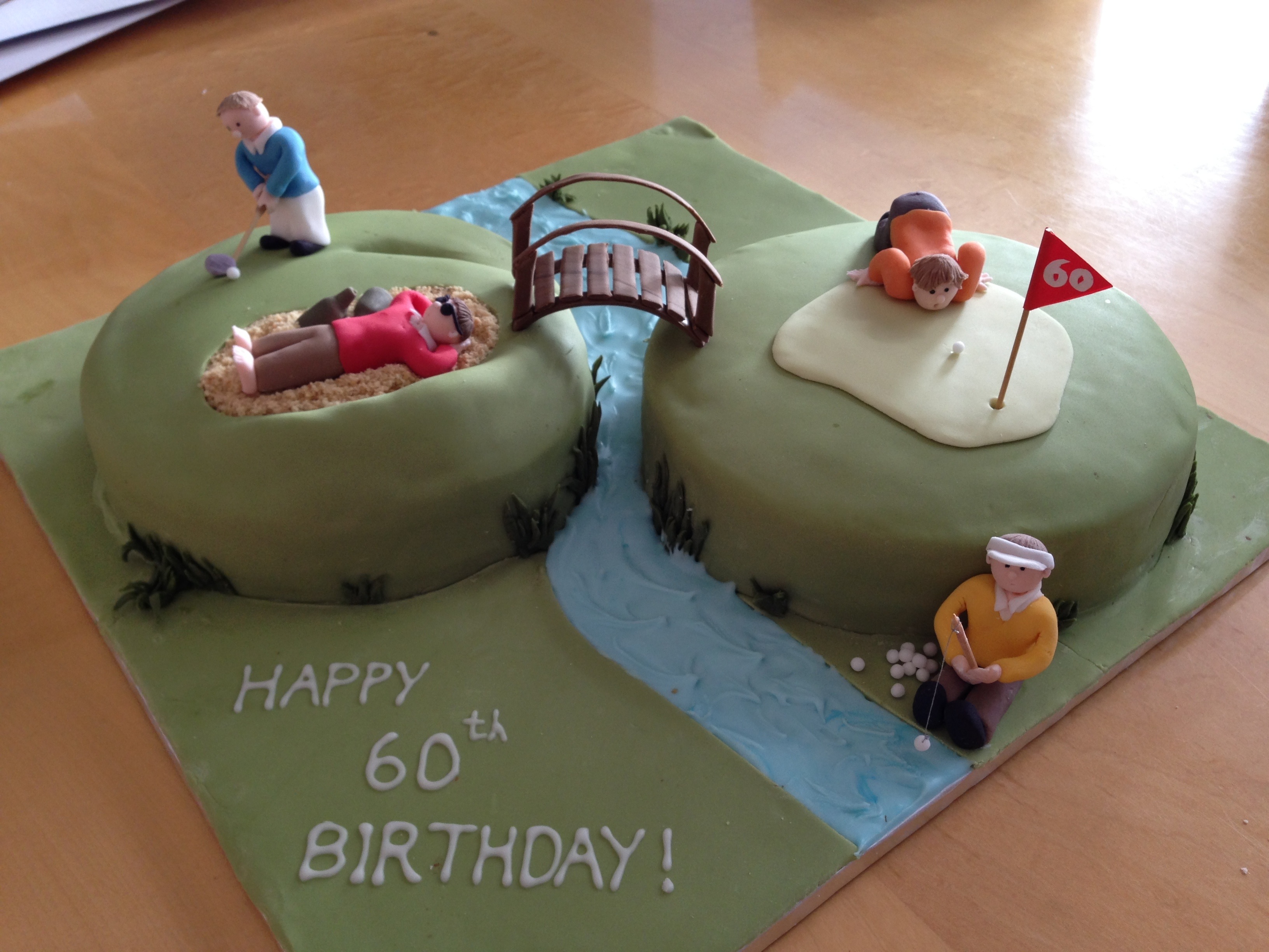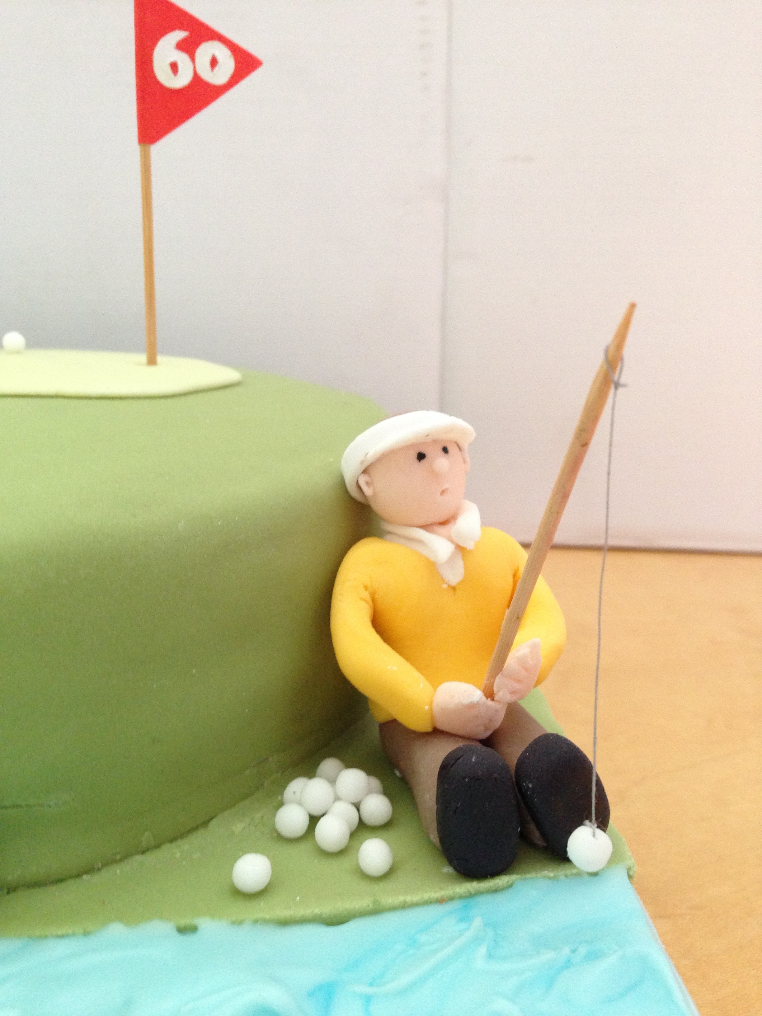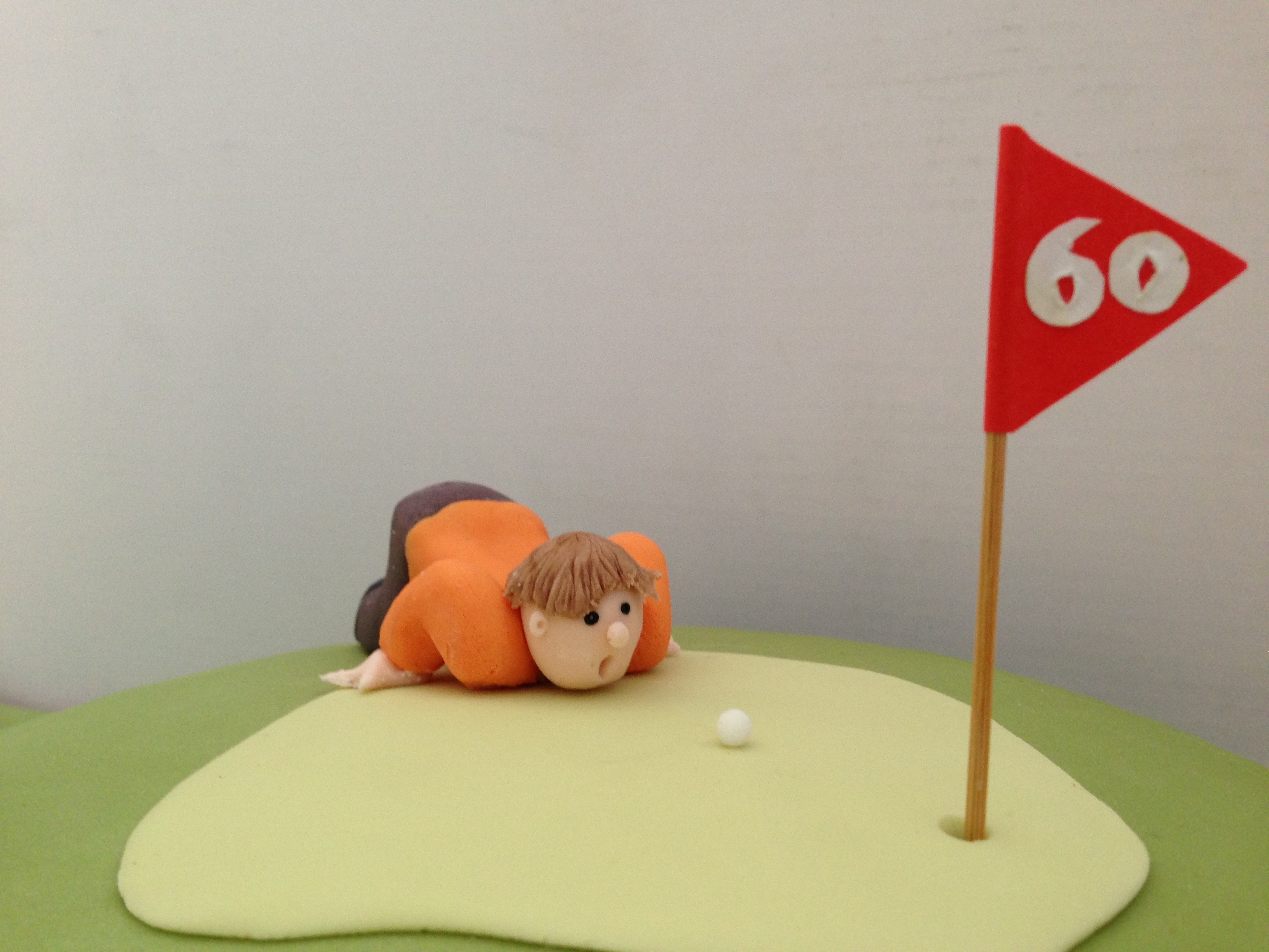I decided to make a “6” and a “0” and make a bridge to join them, with a river running underneath. I wanted to include a bunker and a green with a flag with 60 in the hole, so I put the green in the middle of the “0” cake and the bunker in the middle of the “6” cake. Since Clive liked the bunny cake so much I wanted to make it similar by having several golfers on the cake doing silly things. There had to be one “normal” golfer actually attempting to play golf though….
