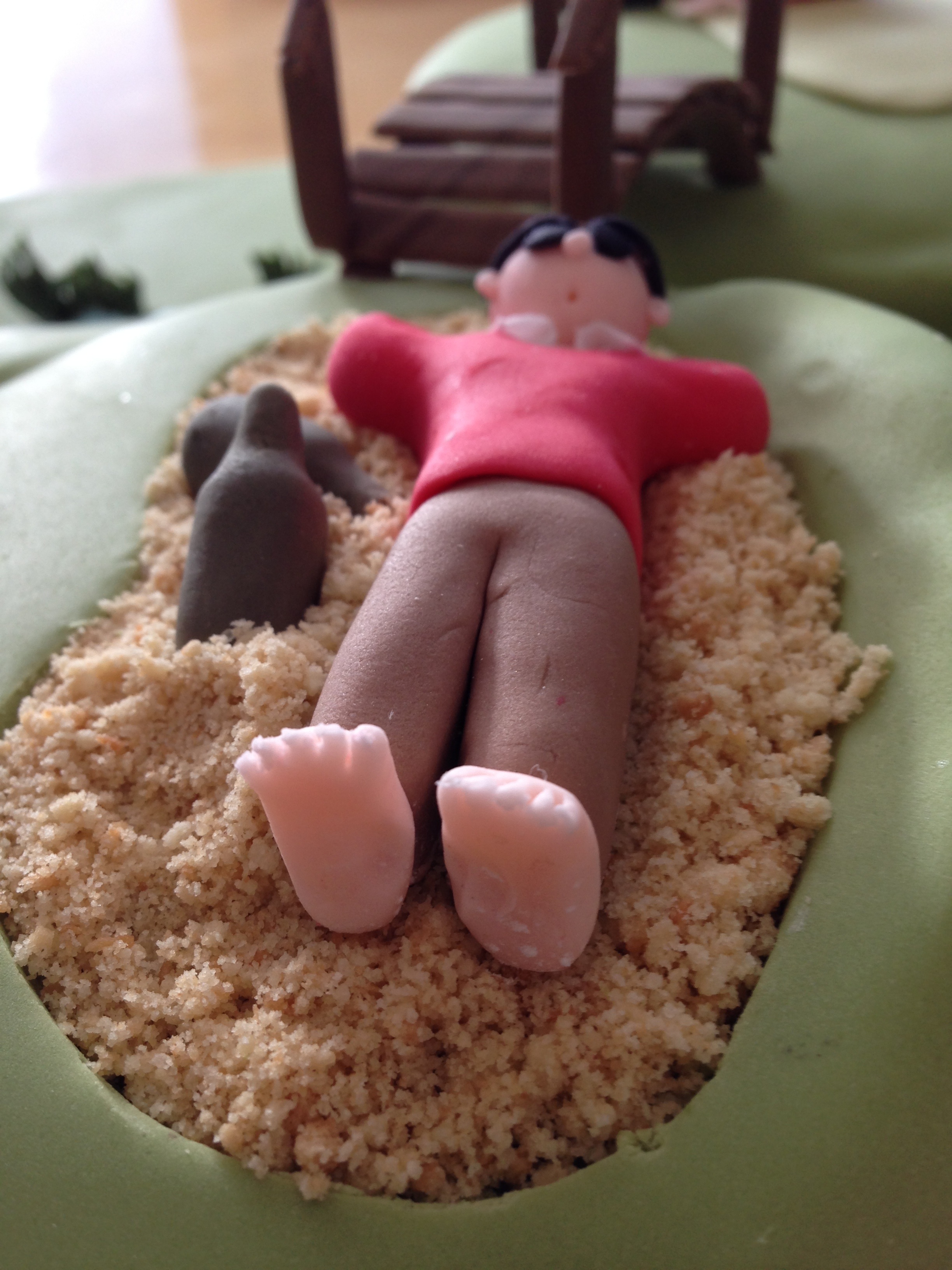 Making the figures was actually the easy bit – the hot weather meant making and icing the cake was harder than usual. Trying to put fondant icing onto warm buttercream was not easy – it was impossible to smooth properly so I used some darker green icing to make some tufts of grass to cover up some of the cracks which I couldn’t smooth.
