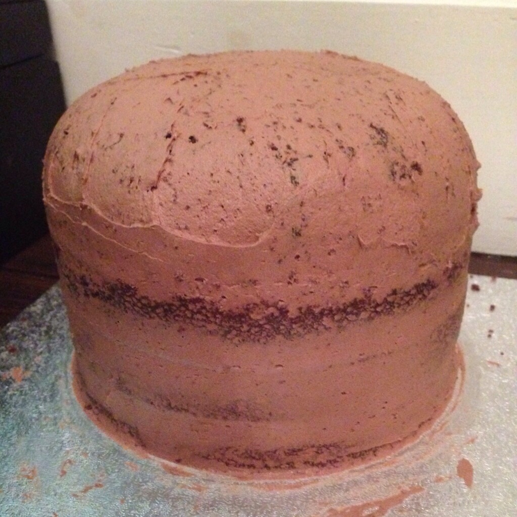 The minion started off as two 7″ deep round chocolate cakes, cut into layers (3 layers each), stacked on top of each and sandwiched together with buttercream. I shaped the top by cutting off the edges to round them and then did a thin layer of buttercream over the whole thing.
