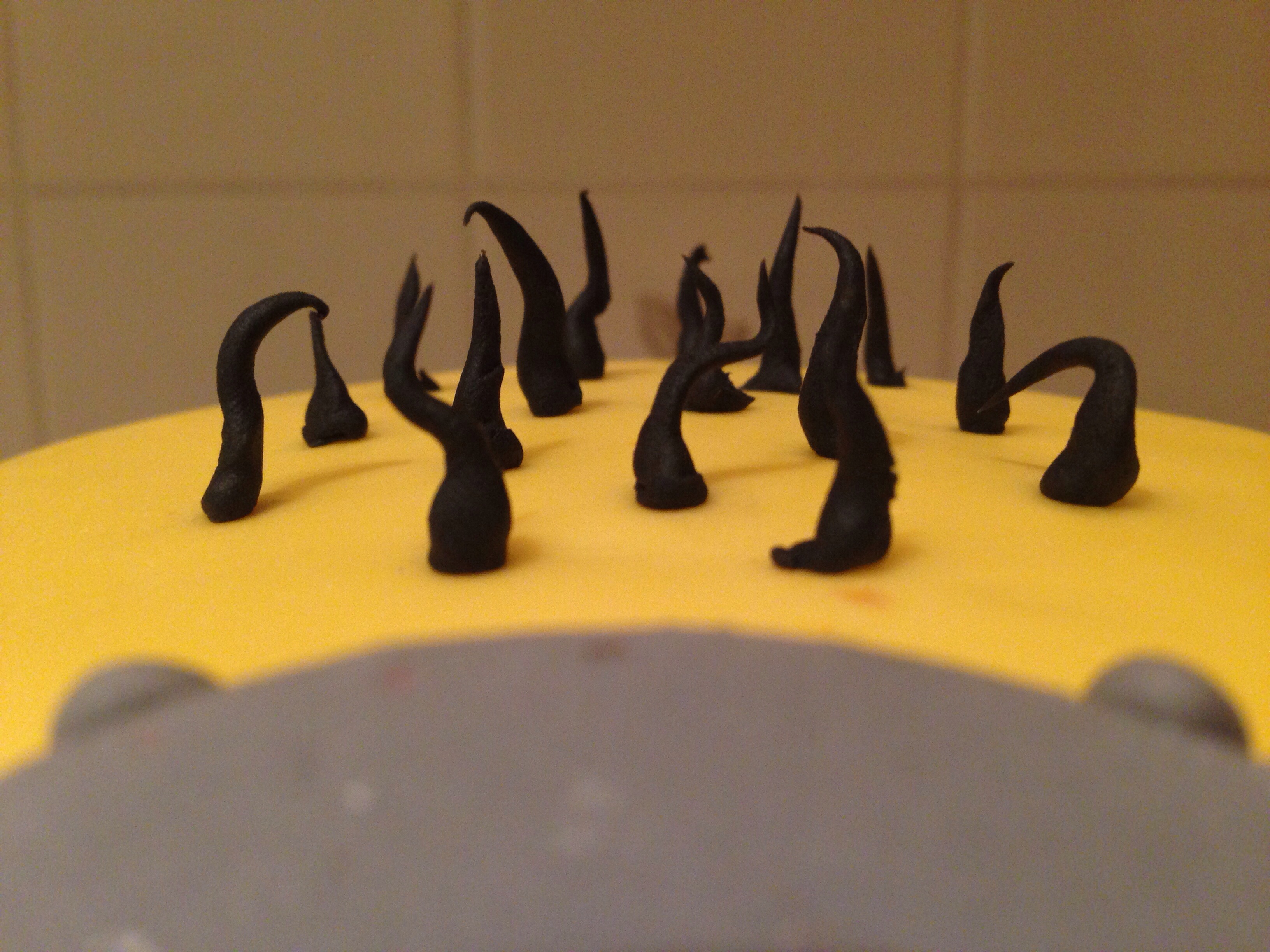 Next I rolled out some black icing and cut out a long strip to go round the back of the head. As with the dungarees I used a knife to make an indent on the black strap about 1mm from each edge – it’s not necessary but it does add the finishing touch and make it look neater. I rolled some bits of black icing between my fingers to create long cones and stuck these to the top of the head as hair.