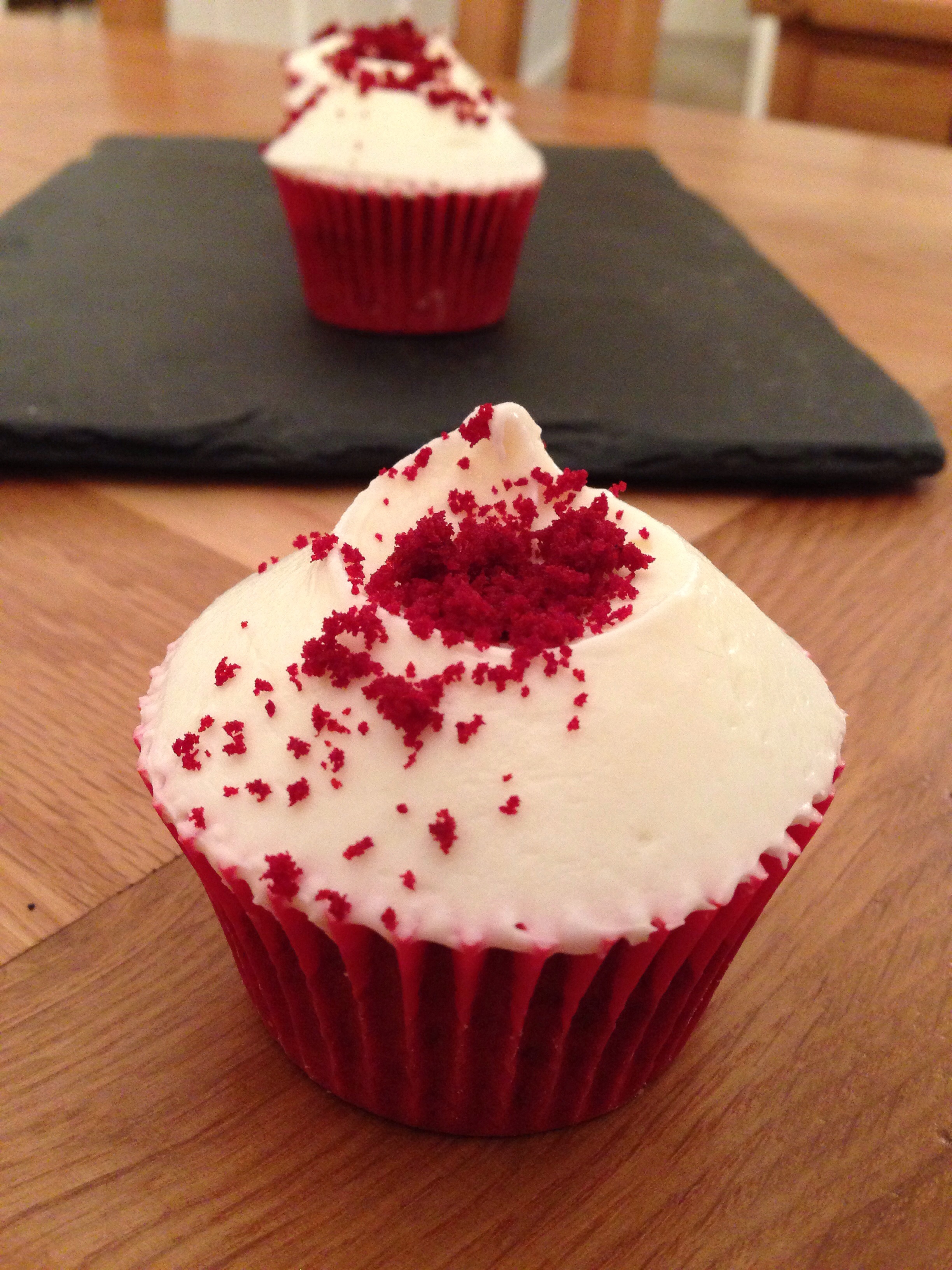 Take out the tins immediately and leave to cool on a wire ready. Decorate once completely cool with cream cheese frosting (see below). I sacrificed one cupcake and crumbled it up so that I could decorate the cakes with red crumbs. Alternatively you could use red sprinkles.