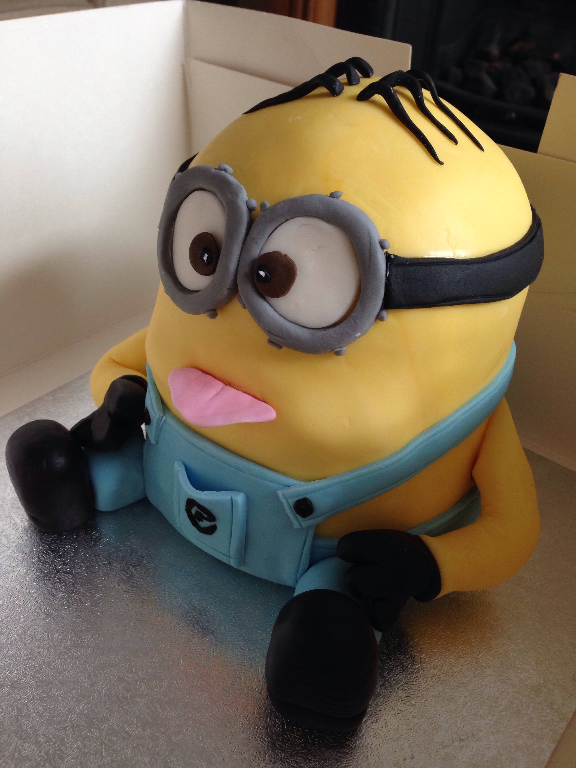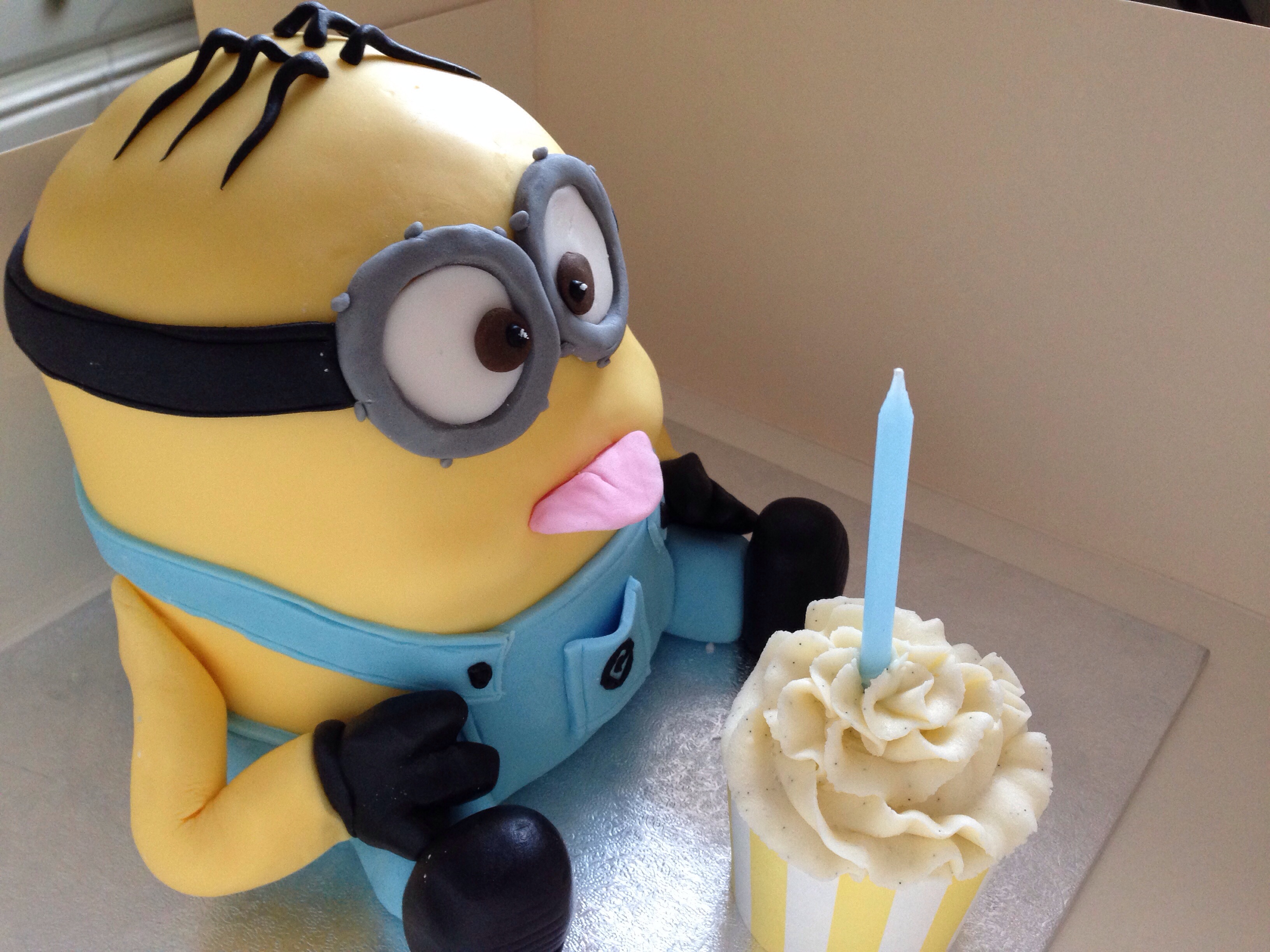 I think I just about captured it – from certain angles he definitely looked like he was blowing a raspberry. I made him in exactly the same as the first minion, but stuck a couple of offcuts of cake to make his cheeks. For instructions on how to make a minion click here.