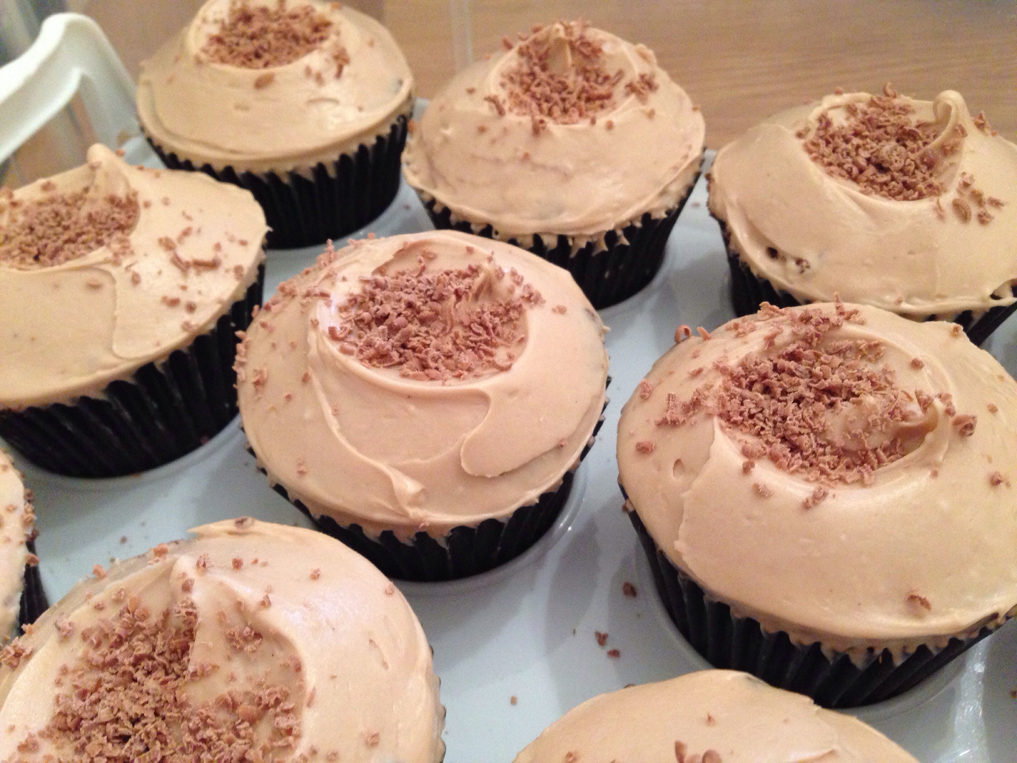 I melted 3 Mars bars with a dash of milk while the cupcakes were baking and then left it to cool while the cupcakes were cooling down too. I’m not sure that the buttercream was Mars bar-y enough but I only had 3 Mars bars so had to make do with that. If I made it again I’d probably up it to 4, maybe 5. I beat 600g of icing sugar and 100g of softened butter together in my stand mixer until no lumps of butter remained. I then added 250g full fat cream cheese, and beat briefly before pouring in the melted Mars bar mixture. I continued to beat it on a medium speed for a minute or so until it was all combined. I then used a palette knife to spread the buttercream on top and finally sprinkled each one with a bit of grated milk chocolate.
