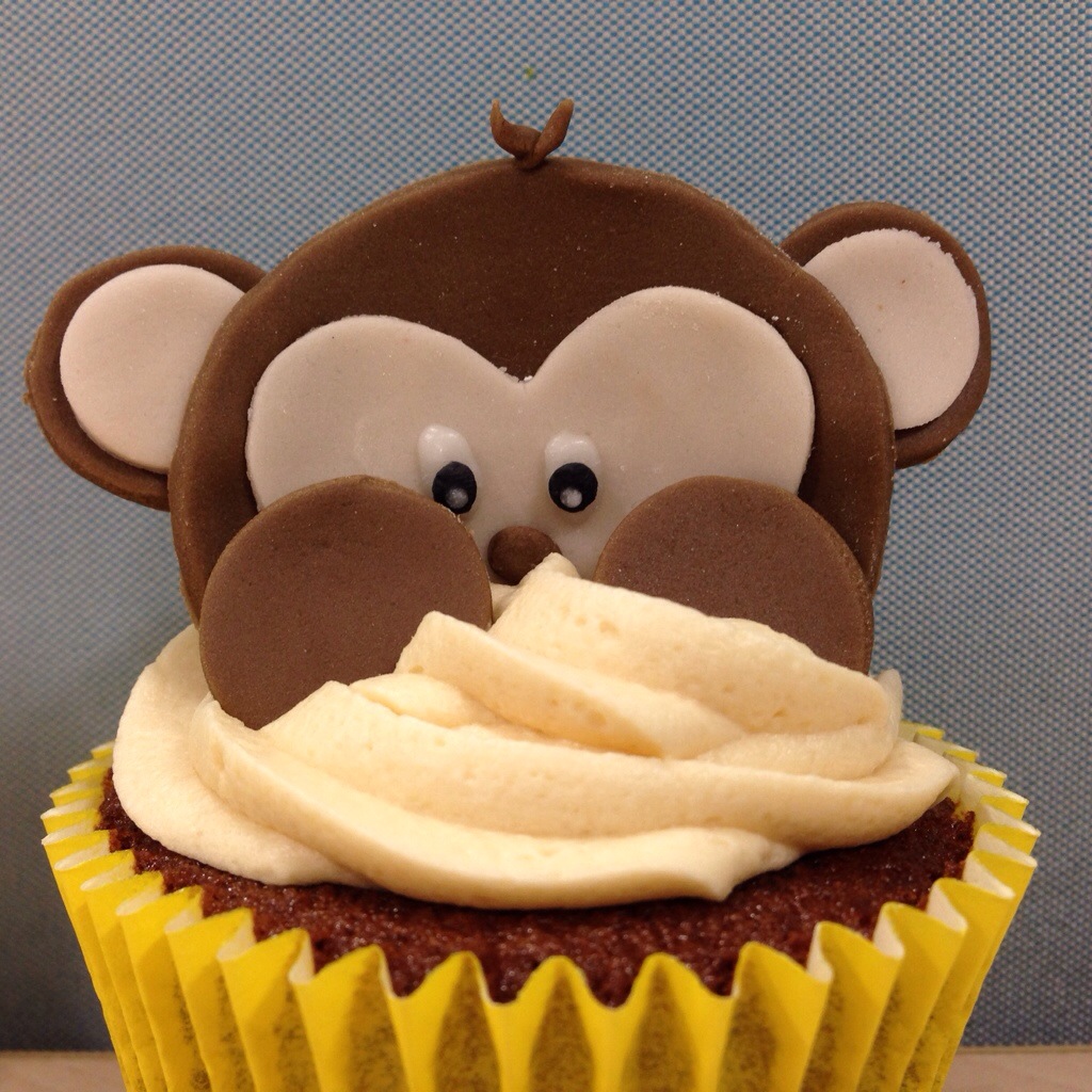 I made 24 of them – 12 monkeys and 12 with bananas on. I was going to take them all into the office in my stackable cupcake box but couldn’t find it anywhere. It turns out that Tom “forgot” to bring it home after he took it to work. This meant I had to use cardboard boxes and could only take one on the train, leaving Tom to take the other box to work – something makes me think he conveniently forgot to bring the boxes home… He’s such a cheeky monkey…
