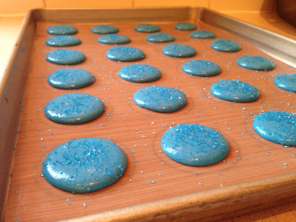 For the macarons I made some plain macarons and coloured them using royal blue gel food colouring. After I’d piped them out I sprinkled them with blue sugar sprinkles and left them to dry out for about an hour before baking them.