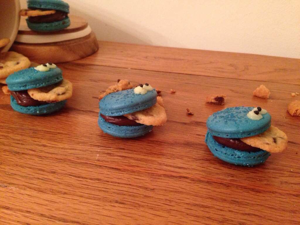 I decided that I was going to bake my own cookies since I wanted to make some small Cookie Monsters and couldn’t buy cookies small enough. I made a standard chocolate chip cookie dough and used a tiny pinch of cookie dough (about pea size) to make each of the small cookies, and a slightly bigger pinch for the cookies for the large macarons. I baked them at gas mark 3 and checked them every couple of minutes until they were done.