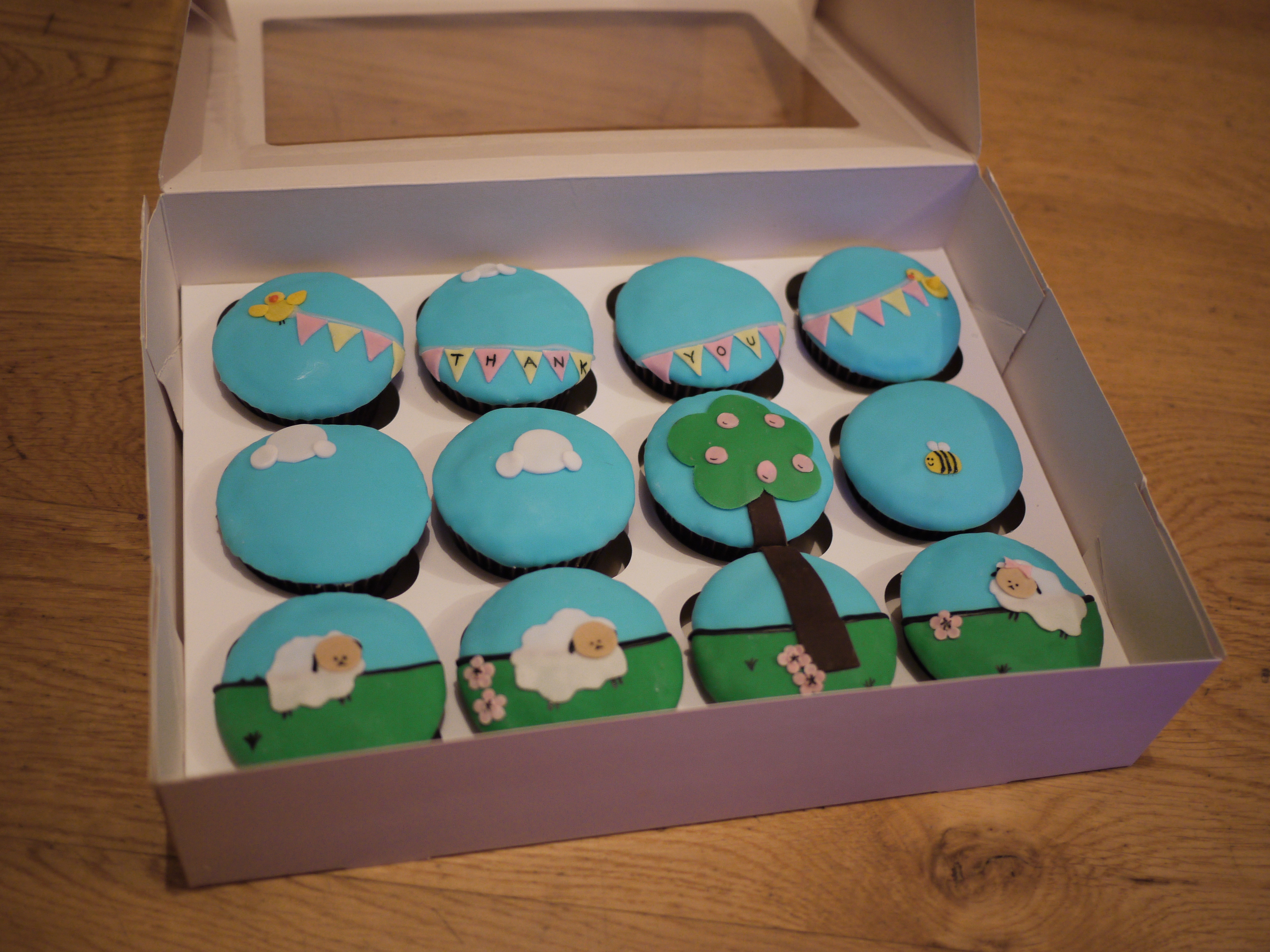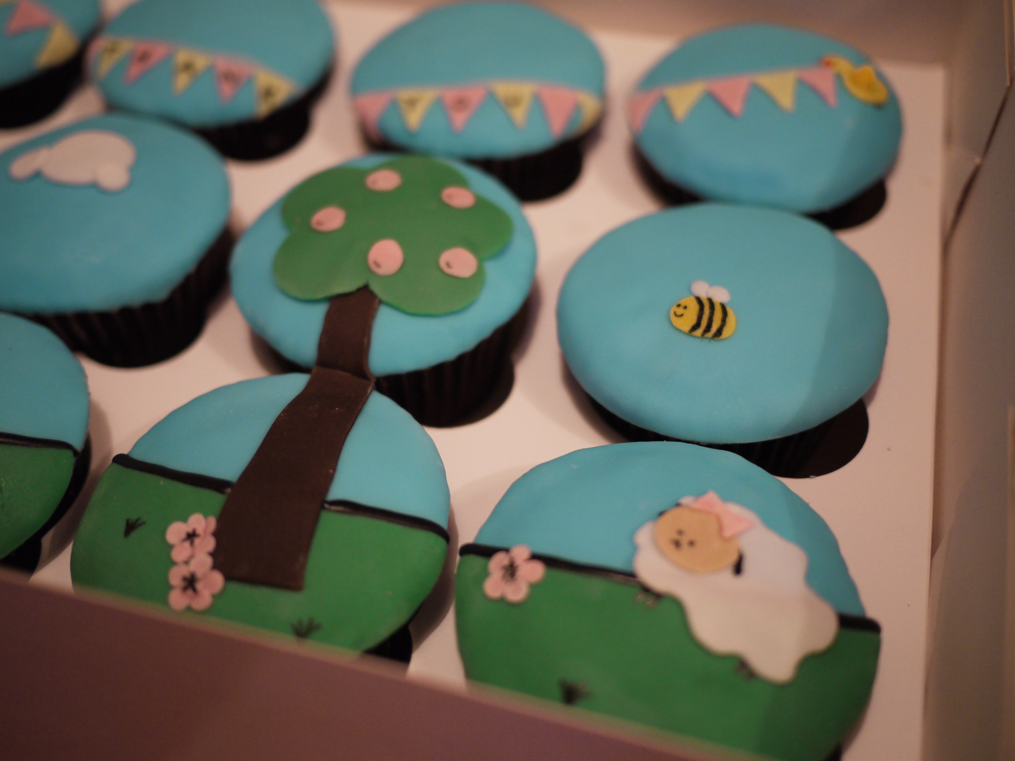 - Next, colour some fondant grass green and roll out to about 2-3mm, cut 2 circles the same size as the blue ones and cut them in half. Take 4 of the cupcakes and place the green semi-circles on top to form the grass. You can either pipe a black line or roll out a thin line of fondant to make a neat black edge to the grass.