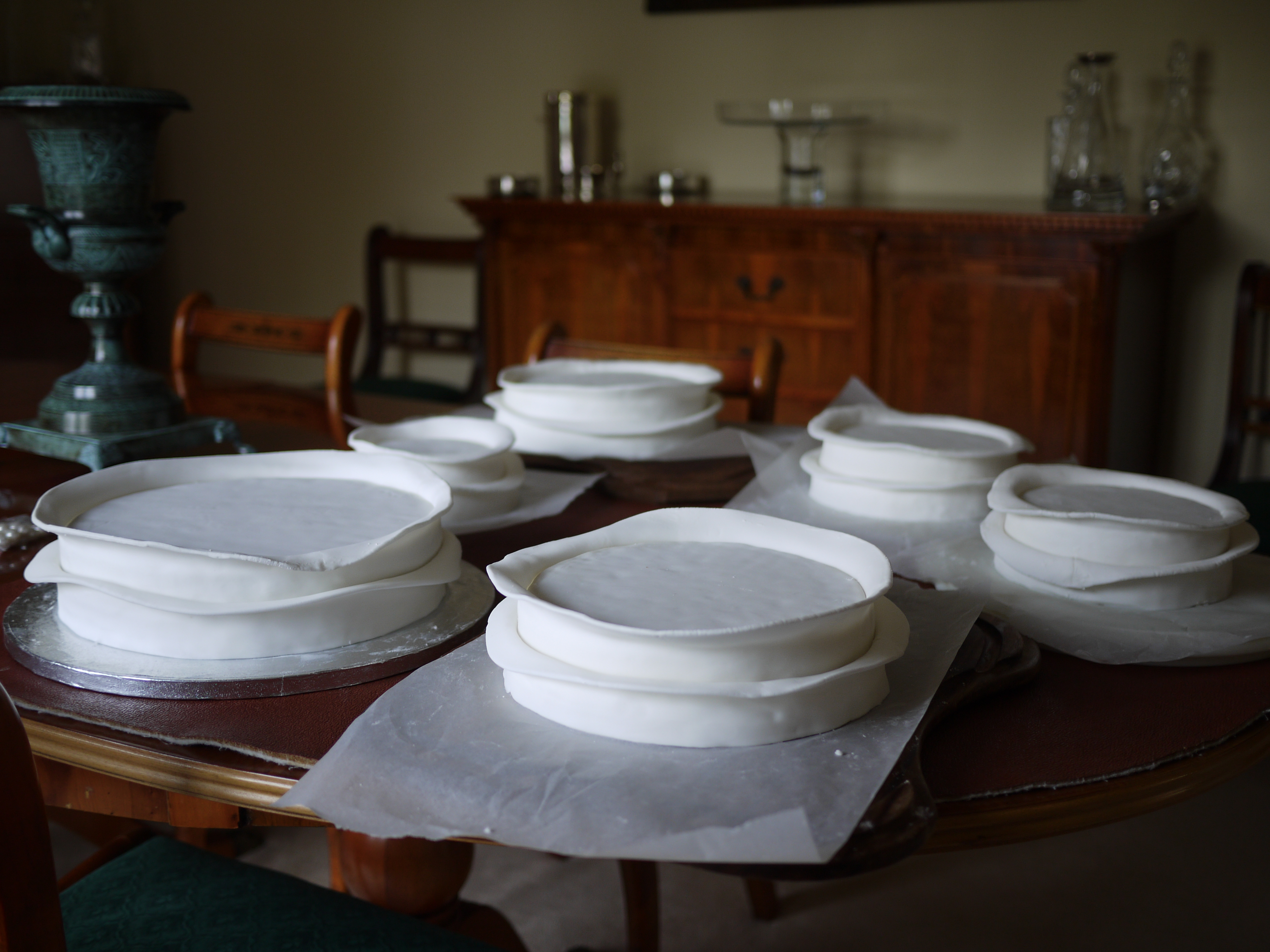 The fondant icing was the tricky part. The top of each cake was iced before I started on the edges. For each edge I rolled out a long straight piece of fondant and put it around the cake, ensuring that the 1st piece was slightly higher than the cake, then I thinned out the top edge, smoothing it and allowing it to flop outwards to make a gentle frill. I then repeated this with a shorter piece of fondant so that each cake had 2 frills around it.