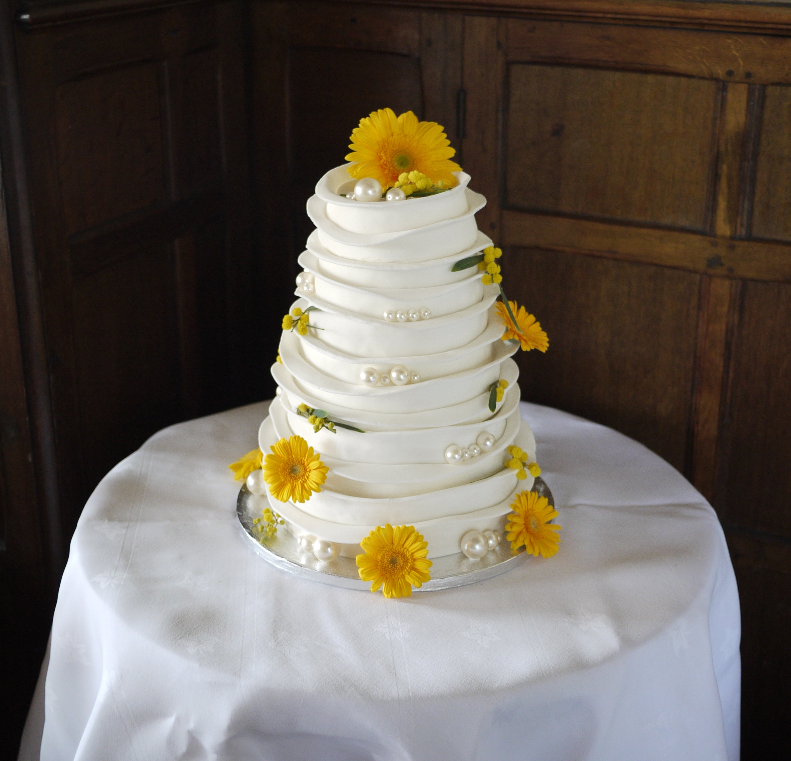 Unfortunately a week before the wedding I had a bad cycling accident and wasn’t really in a fit state to take the cake to the venue and assemble it. Luckily my Mum, my husband Rich and good friends Hugh and Sylvie came to the rescue! They carefully drove the cake to the venue and had the tricky task of putting it all together. It should have been very simple, just placing each tier on top of the next one, but some of the tiers were a bit too wide at the bottom and didn’t quite slot into place, so they had to be trimmed! Finally once it was assembled it was decorated with real flowers and different sized large fake pearls. I was just about well enough to make it to the wedding the following day to see Chloe and Rory getting married and although I didn’t stay for long, I heard that the cake went down well!