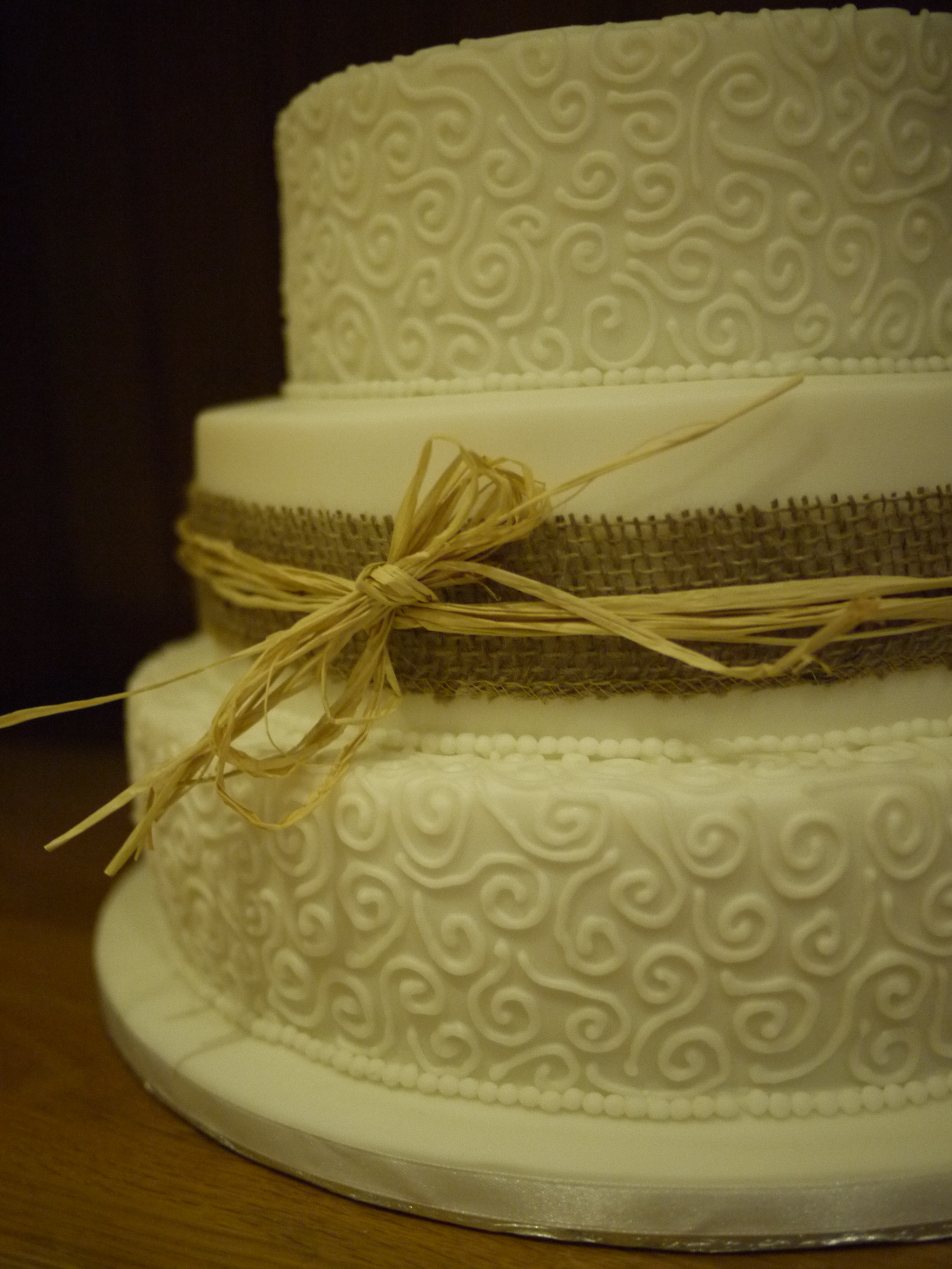 Then the fun with the piping began! Getting the right consistency for the royal icing is key, it needs to be runny enough for it to come out through the nozzle (smaller holes need slightly runnier icing) but firm enough to hold its shape. It can be quite hard to get a happy medium and even just adding half a teaspoon of water can make a huge difference. Once I had the right consistency I began piping starting with the bottom tier. The swirls were completely random and I found it best not to think too hard about it and just keep the swirls flowing. A couple of hours later I finally finished the swirls! The finishing touches of the hessian and raffia were then added to the middle tier to complete the rustic look. Congratulations Ben and Tash!