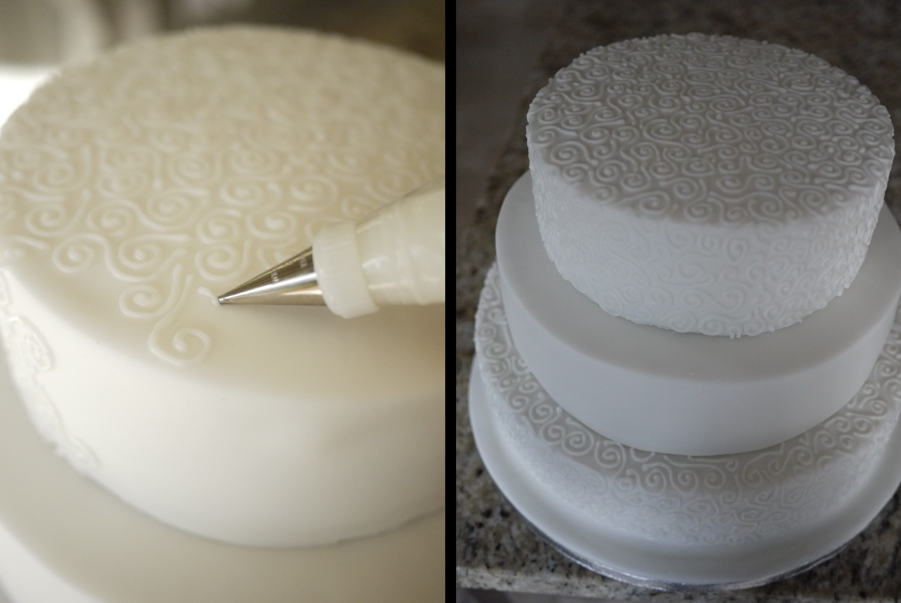 The 3 tiers were then stacked using dowling and the joins were covered using fondant that had been pushed into a silicone mould to make a string of beads. I decided that it was best to assemble the cake before doing the piping, so that I wouldn’t damage it by moving and lifting the layers afterwards.
