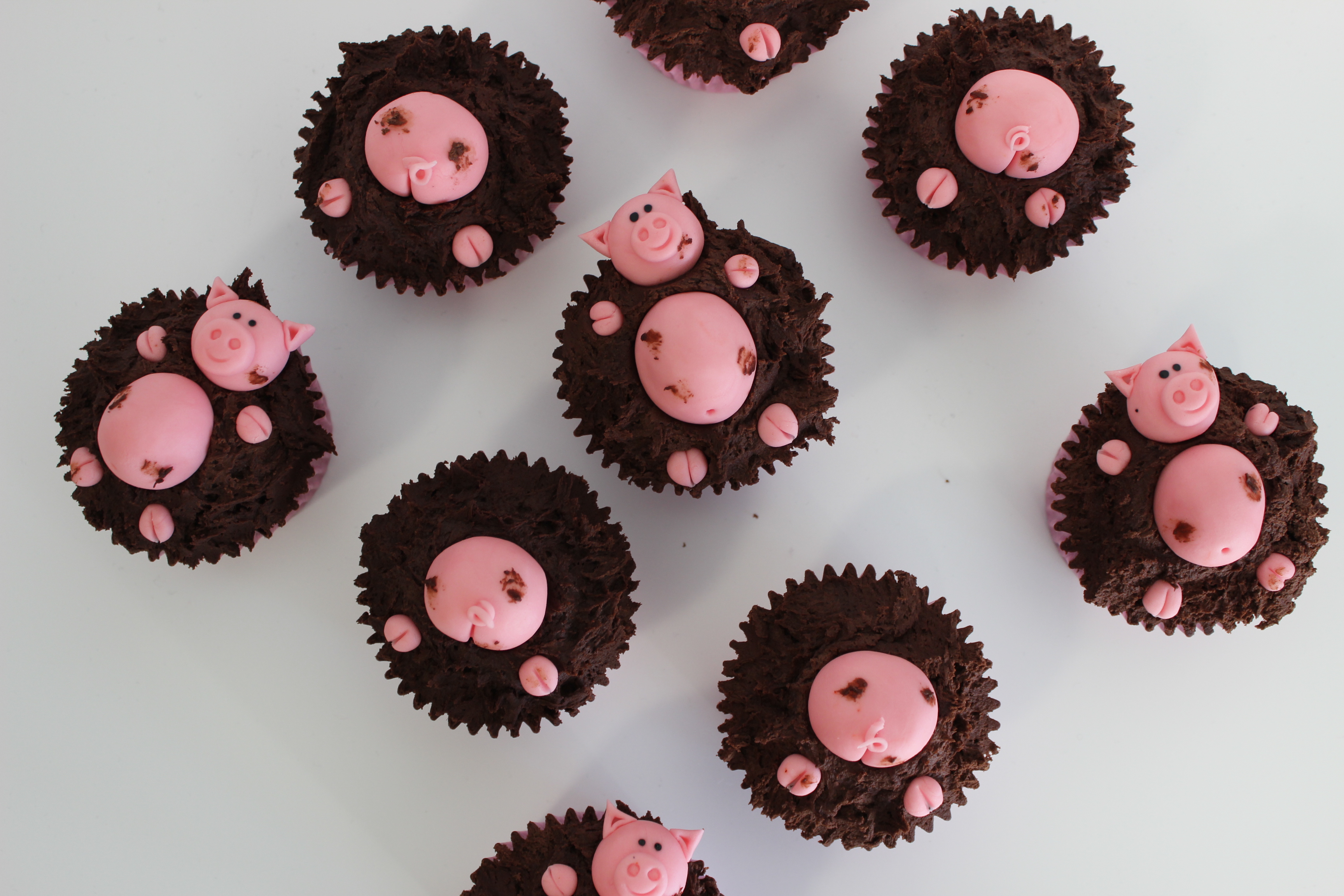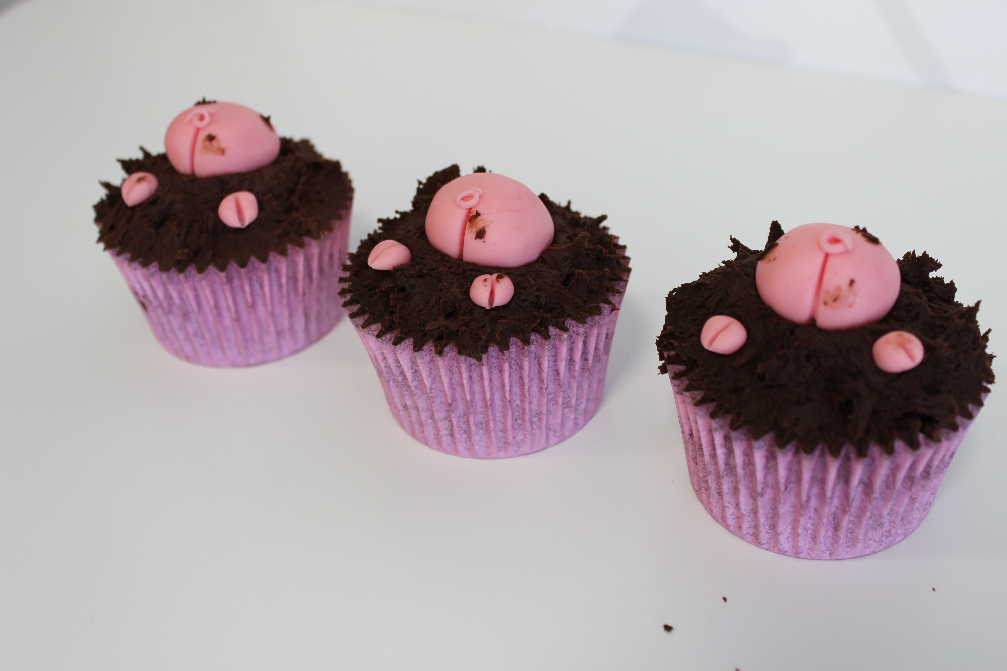 Finally using a paintbrush mix a bit of buttercream with a splash of water and paint a few patches of “mud” onto the little piggies…