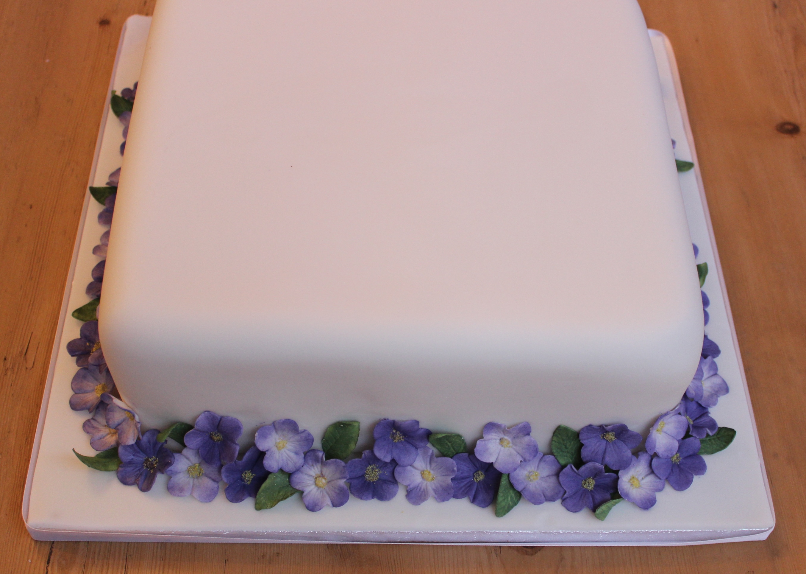 After I had covered the cake in marzipan and icing, I used edible glue to fix the flowers in place. I didn’t want them to look to organised but I put them on in groups of threes, with two on the bottom row and one above – I mixed up the dark and light flowers and placed the leaves whenever I thought one was needed. I really liked the overall effect – simple but with plenty of colour and texture.