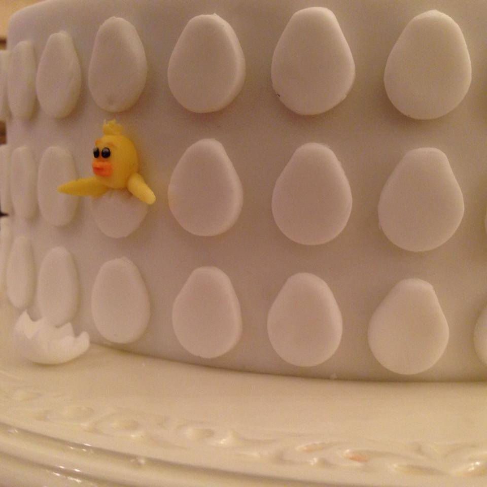 Using some white fondant, we used a ball tool to create the egg shells that were placed on top and round the edge of the cake.