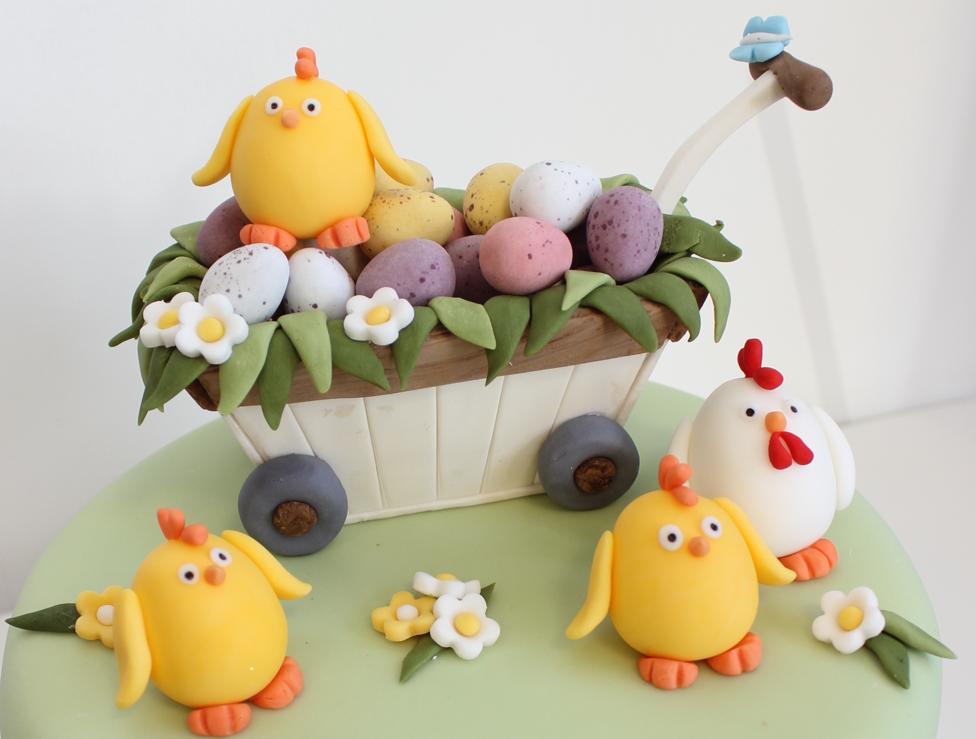 We wanted to sell raffle tickets the day before so I made the decorations and took some photos of them so that people could see what it was going to look like. The chicks were super quick to make – I made egg shapes out of fondant icing for the bodies and then made the eyes, beaks etc (also out of fondant) and stuck them on using a drop of water. The flowers were cut out using a small flower plunge cutter and then I stuck a small ball on fondant into the middle of each one.
