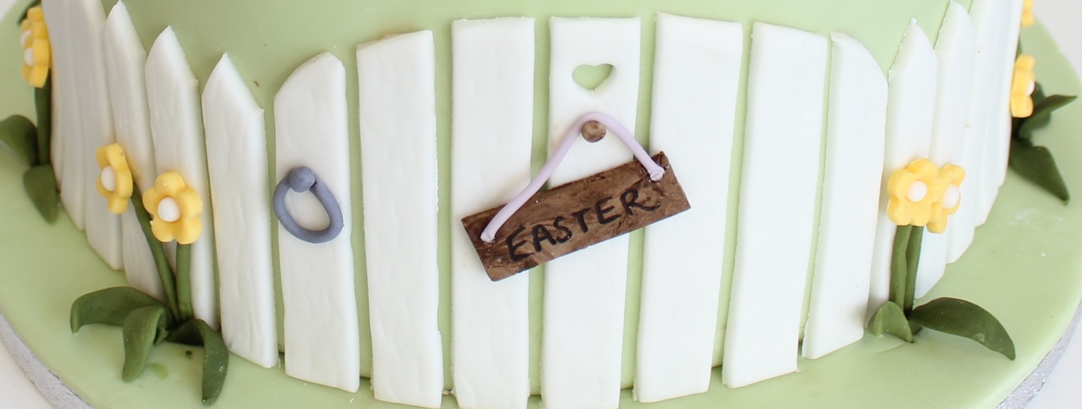 I covered the whole cake and board in green fondant icing and then rolled out white fondant to cut out a fence and gate – I cut out a strip that was about 5cm wide and then used the pointed end of a heart cutter to cut out triangles. I then cut it up into strips so that I had lots of fence posts with pointed ends.