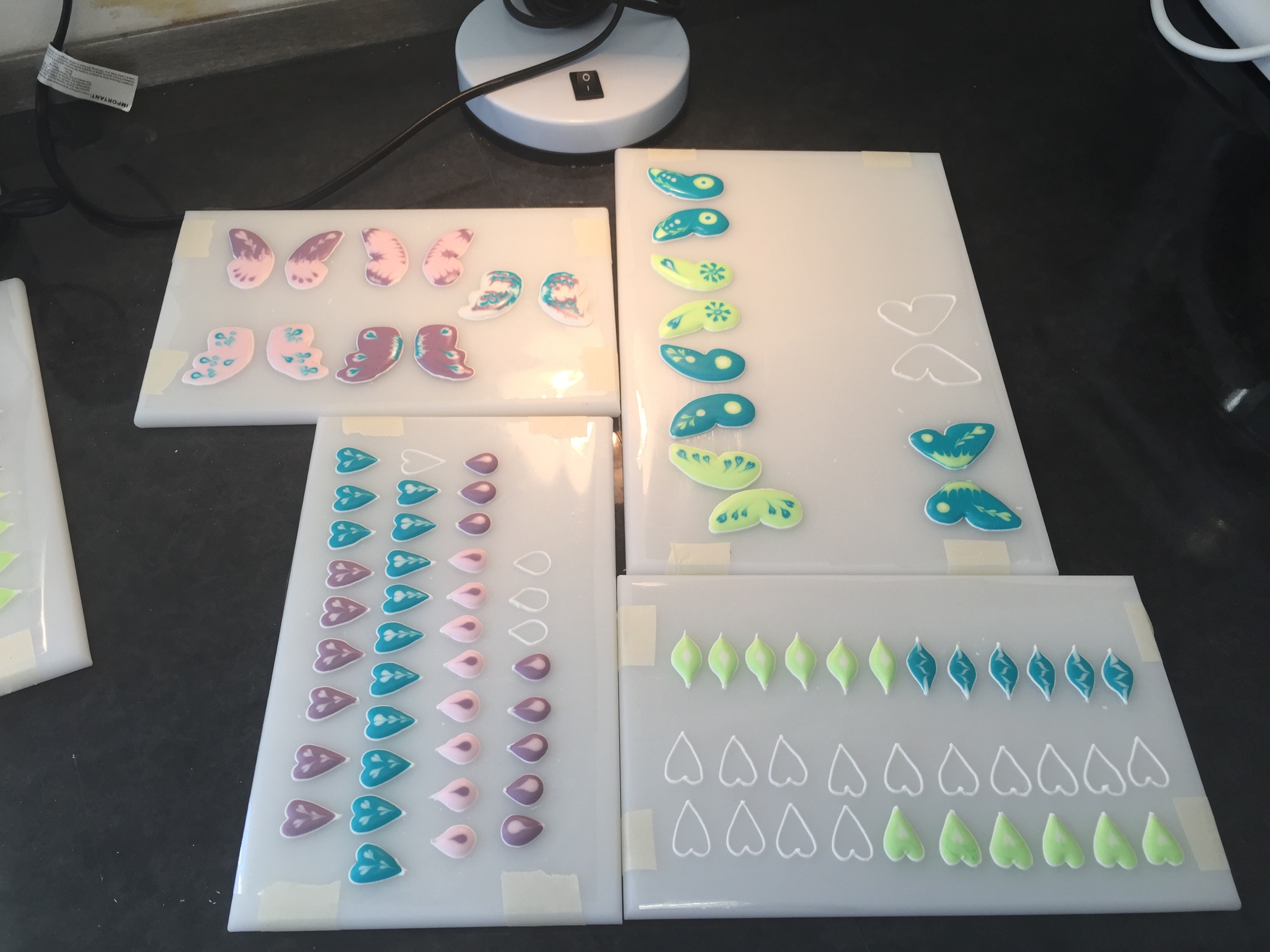 We also practised our piping, mastering straight lines, curved lines and shapes. We then put this to use to create some butterflies and flowers, where we piped the outline first and then flooded it with runnier royal icing and created patterns with different colours.
