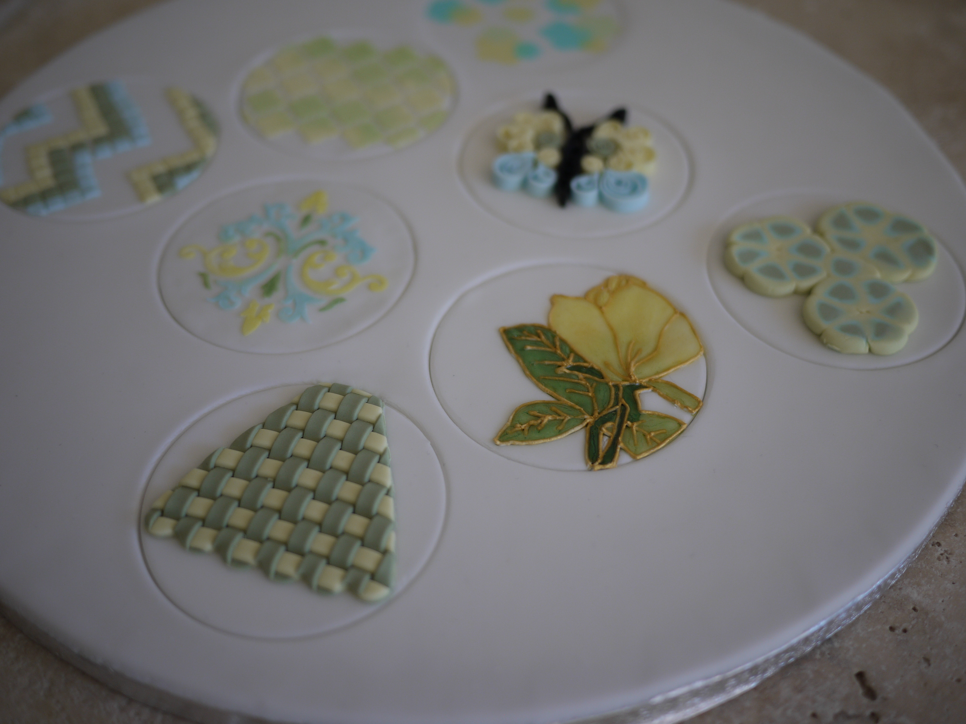 We were taught some new techniques using sugarpaste and used these to create a mood board. We used the same combination of colours for each technique and experimented with various shapes and patterns. We had a go at quilling, weaving, enamelling, stencilling with sugar paste and royal icing to name a few.