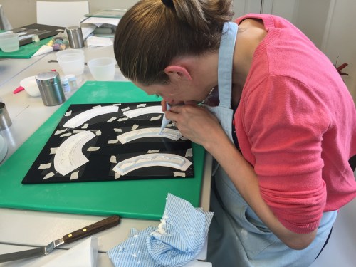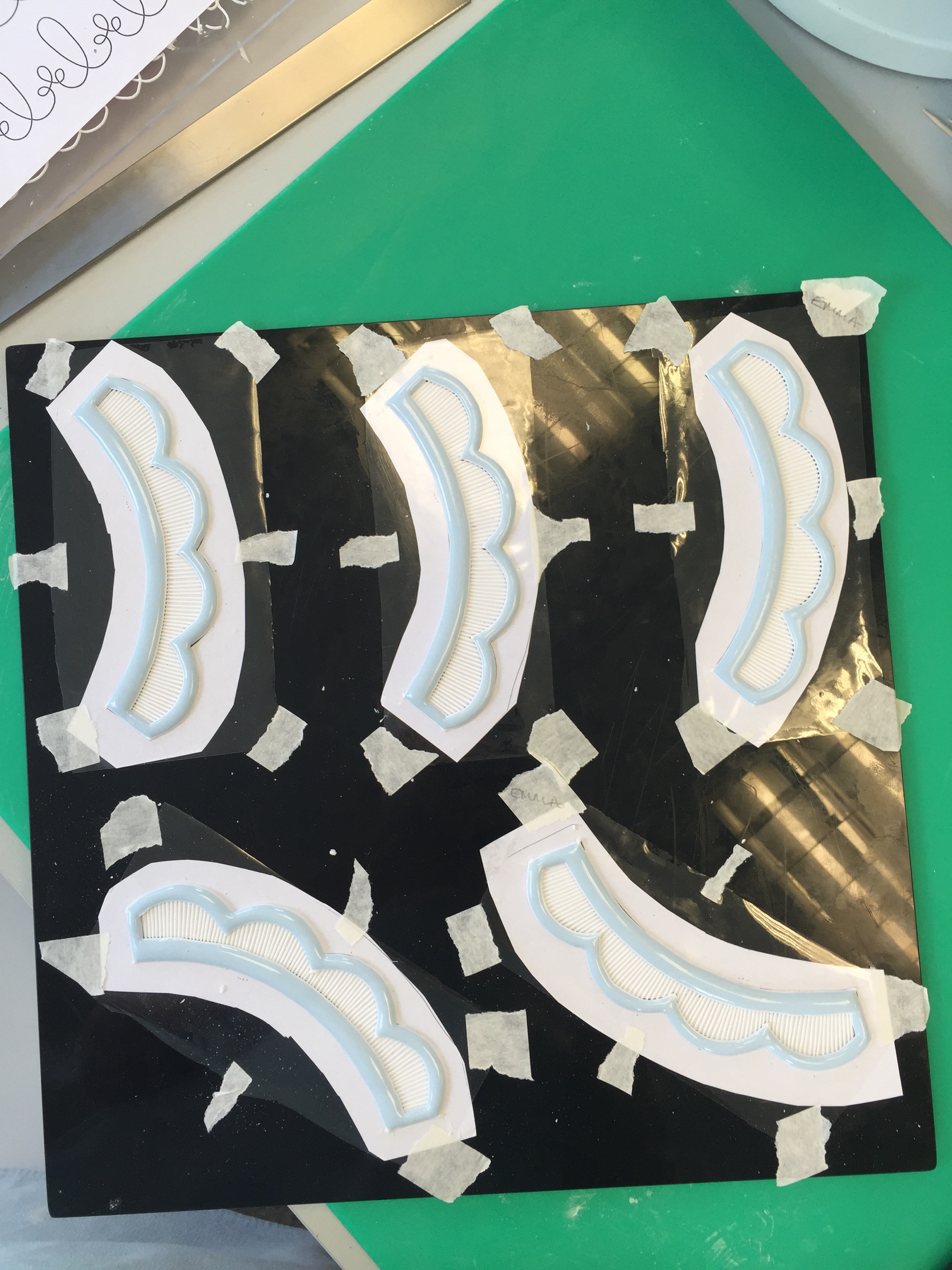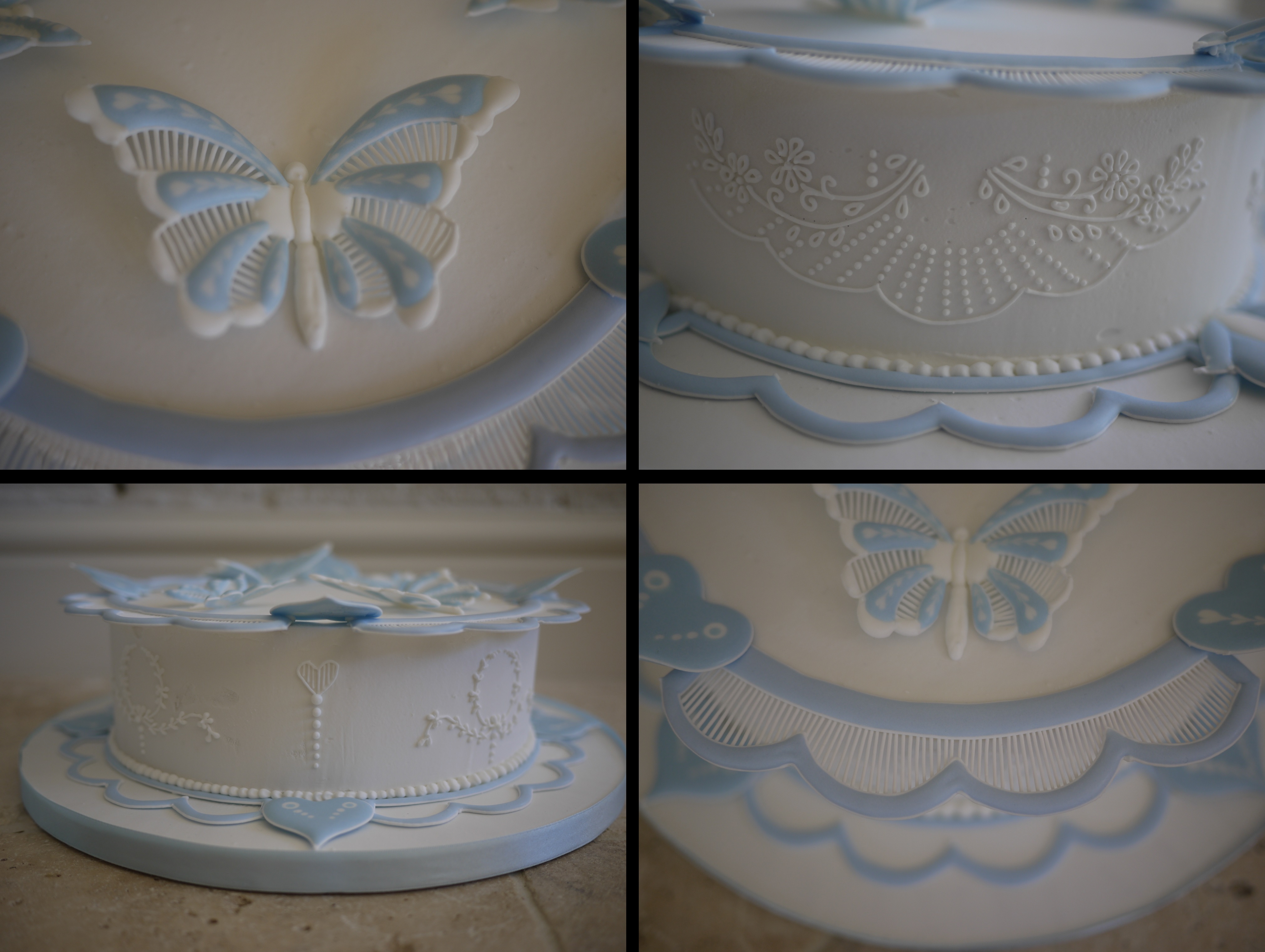 On the 2nd day, we coated our fruit cakes in another layer of royal icing and then learned how to make a collar. The designs were very intricate compared to anything we had done before and required a lot of concentration to pipe all the tiny straight lines. We also started making some overlays and butterflies to decorate our cakes with.