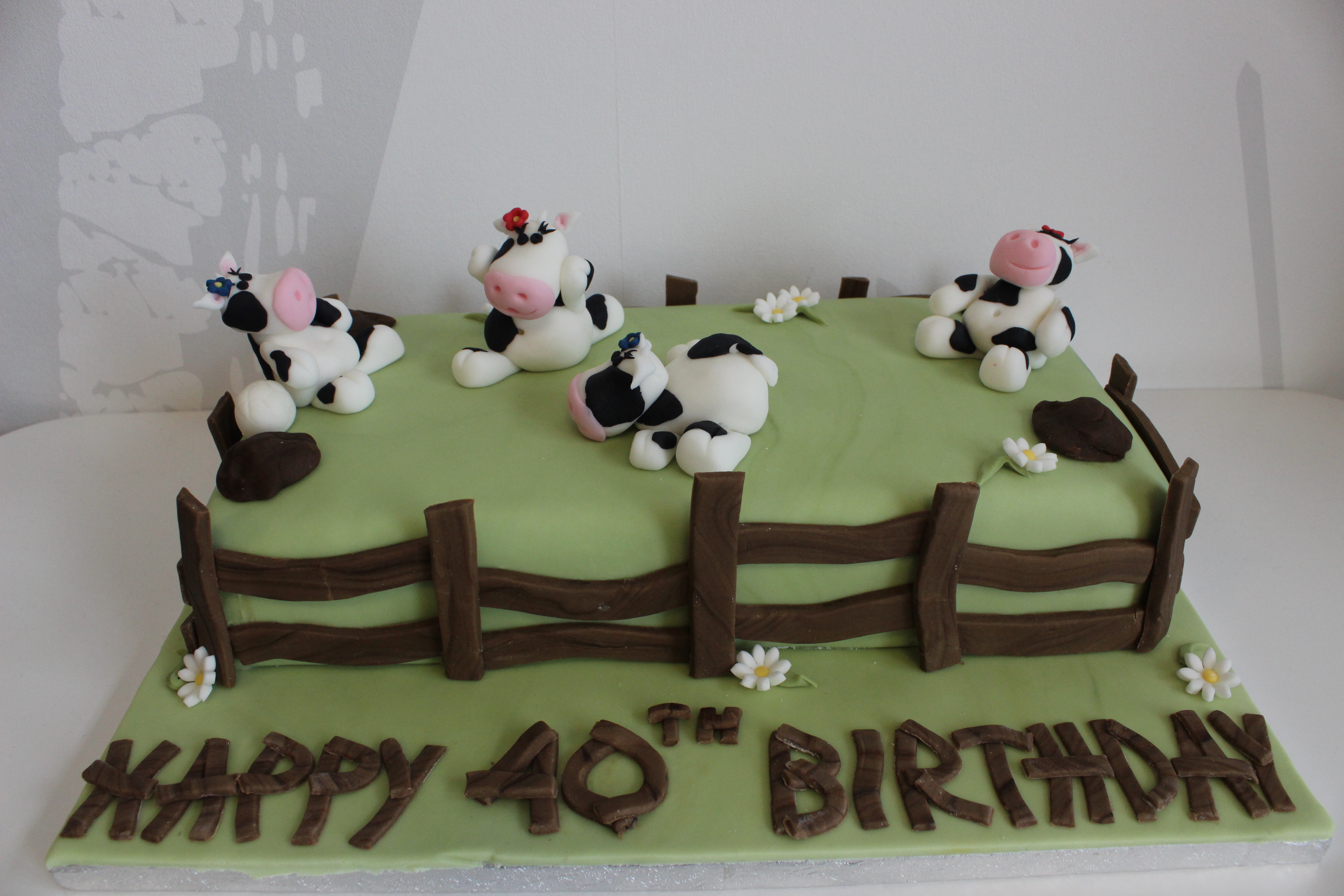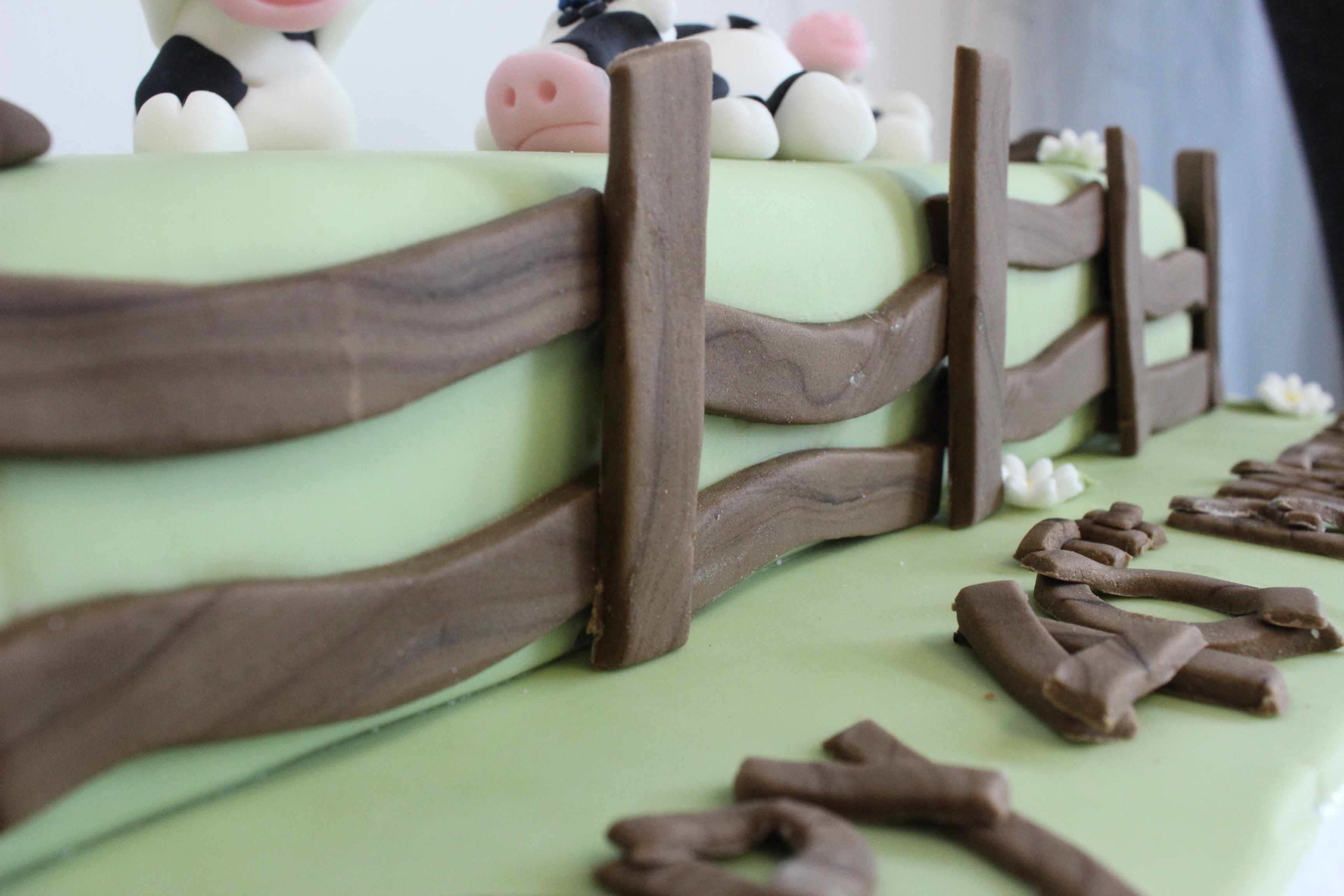 I made the fence posts the night before so that they were hard and would stand upright round the cake. I used the same marbled brown icing to make the writing (in the same style as the fence) and the remaining lump of brown icing was used to make some ‘cow pat’ goal posts! I also made the flowers to add a bit of detail.