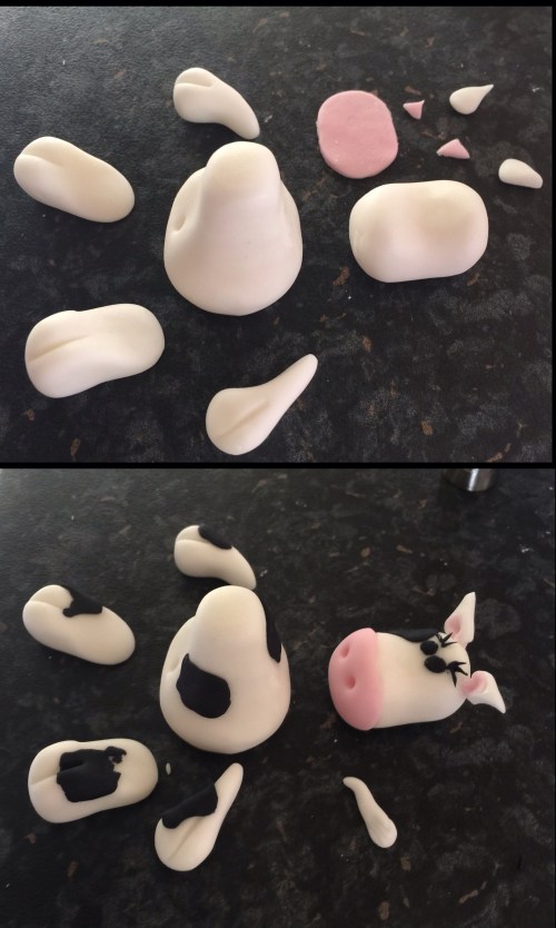 I made all the cows in advance – they were all made using the same basic shapes as shown in the photo below. I made them out of white and then stuck on random black patches. The only other detailed that I added to them was a flower to show which team they were playing for! I assembled them by sticking all the pieces together using a bit of edible glue.