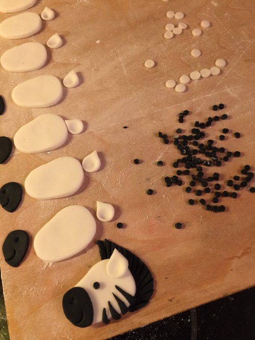 These were very satisfying to make – you cut out lots of shapes and when you stick them together they create animals! The photo below shows most of the steps for how the zebras were made (ignore the white circles – they were the eyes for the elephants which I made at the start while I was using the white icing so I knew that I could colour the rest of it!). The mane was made using a large petal cutter with cuts down the side, and the stripes were just thin triangles I cut out with a knife.