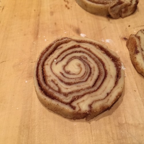 I found that chilling for a couple of minutes after cutting each slice (in lots and lots of icing sugar!) helped – not something the recipes said to do but in a hot kitchen the “Swiss roll” heats up quickly making it hard to cut 1cm slices off it. We tried the ends last night and they were really good – I can confirm that they also go well with coffee for breakfast!