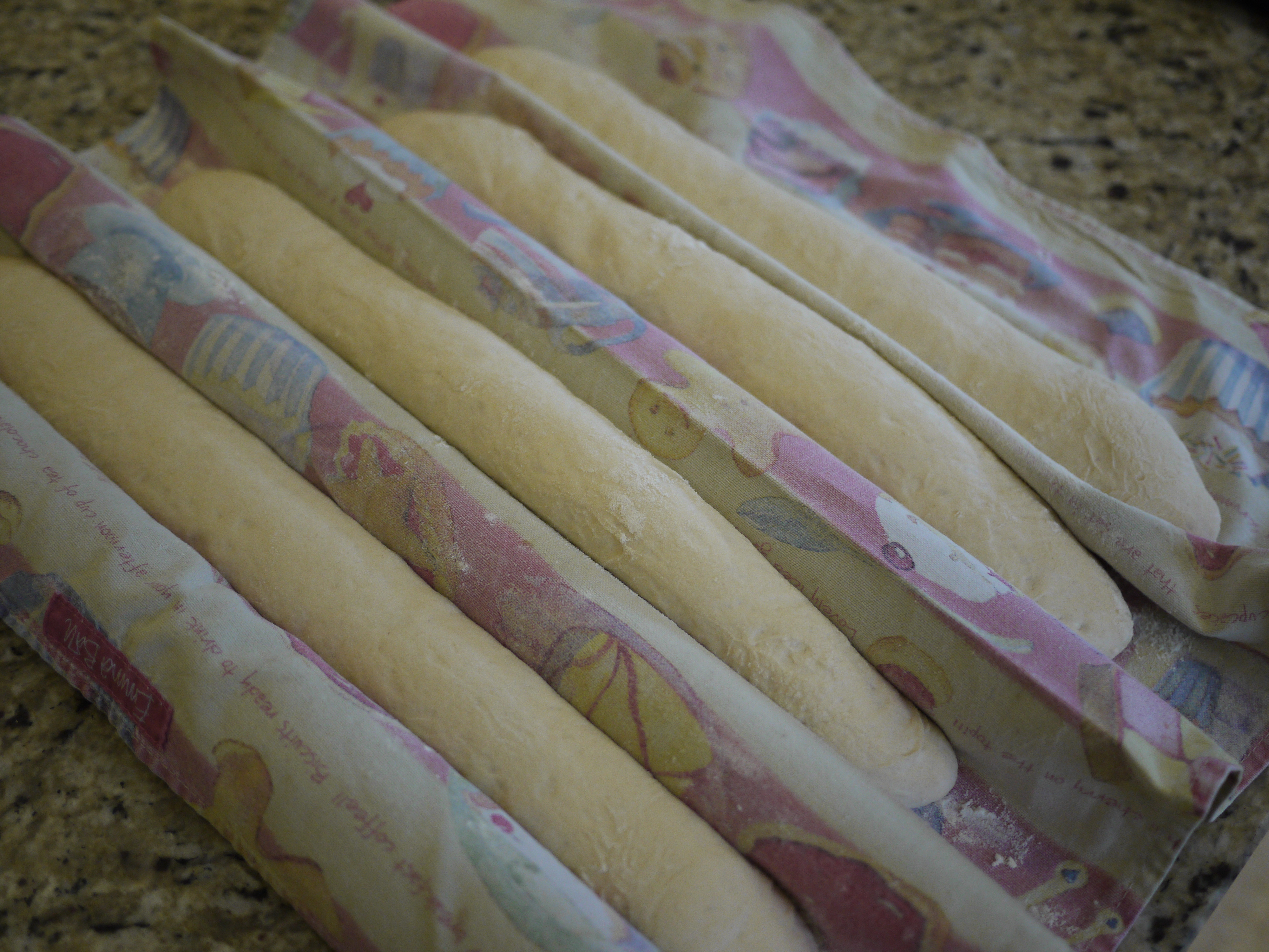 So far, so good, the dough rose nicely and I followed the instructions and cut it into 4 equal sized pieces and rolled it out. I didn’t have a linen couche, so I decided to use a clean tea towel and rolling pins to make the folds. It seemed to work ok, one of the baguettes stuck to the tea towel a little bit.