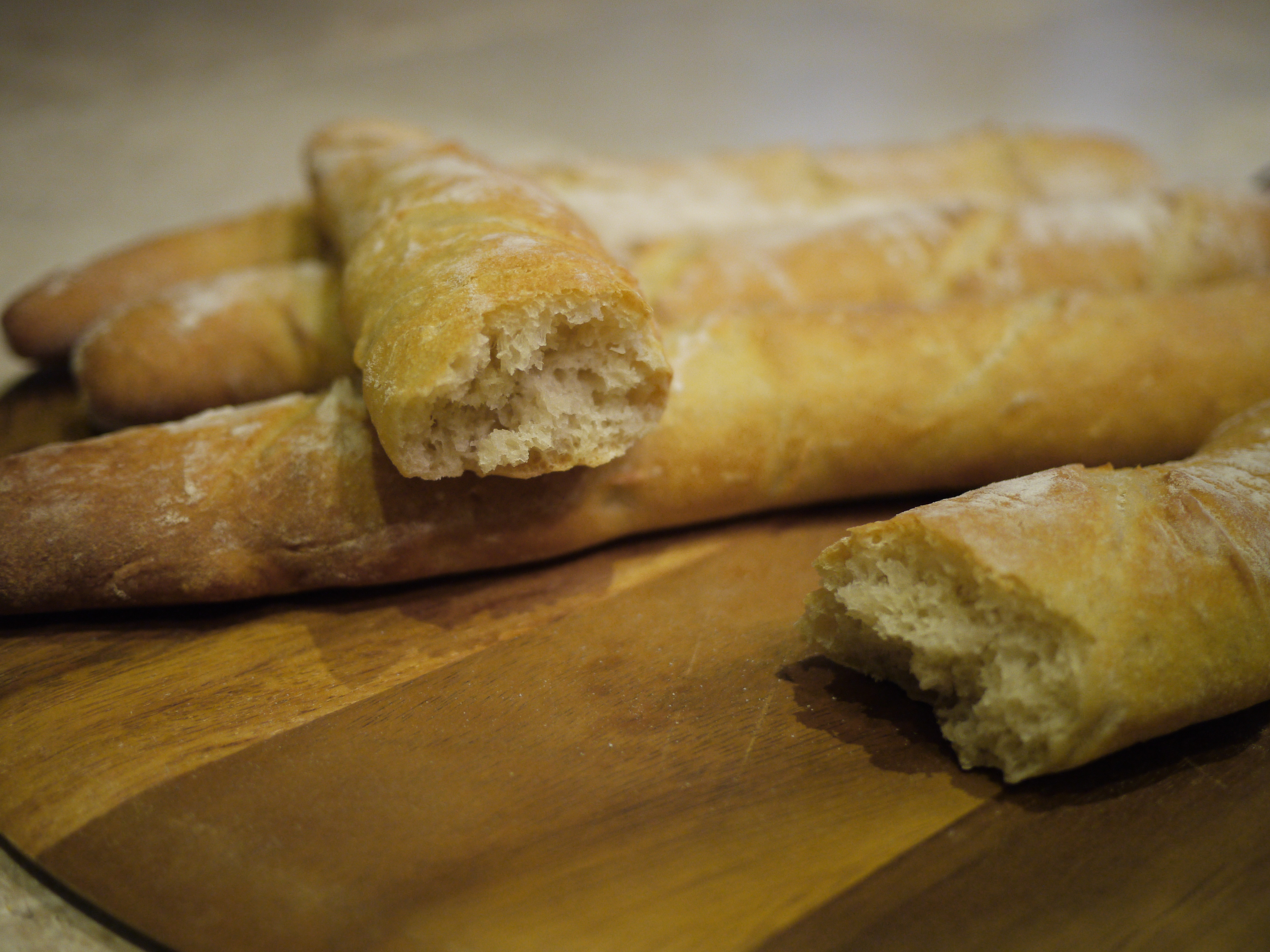 The hardest bit, was getting the baguettes from the tea towel onto the baking tray, the 1st one ended up very distorted, I tried my best to handle the others less and they looked marginally better. I also didn’t have a razor blade to make the 4 slashes, so I sharpened a small knife. It wasn’t any way near sharp enough and didn’t make a nice smooth cut through the dough. A couple of the baguettes ended up a bit deflated!