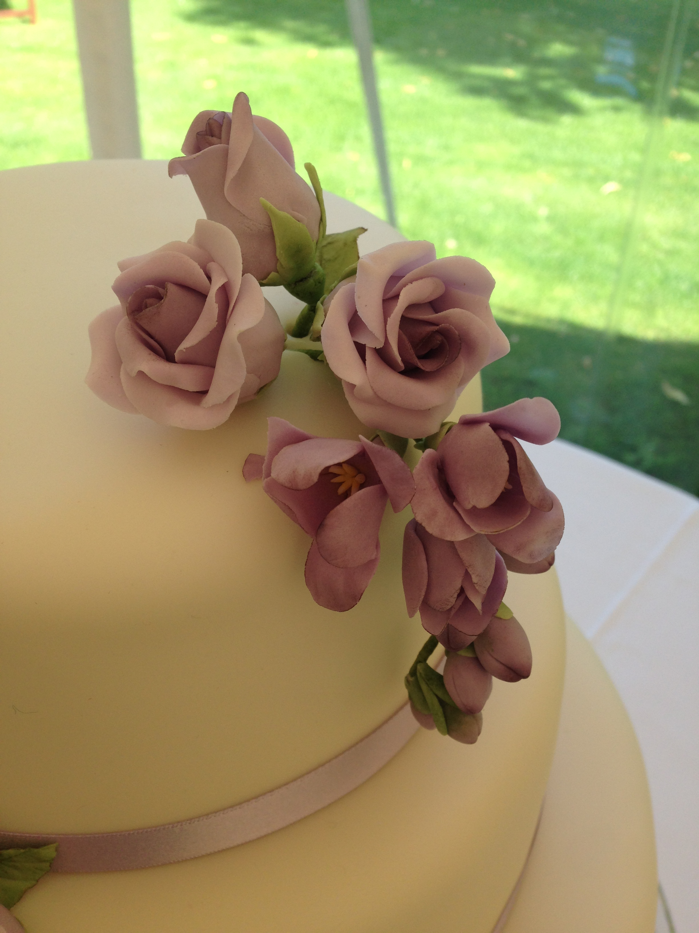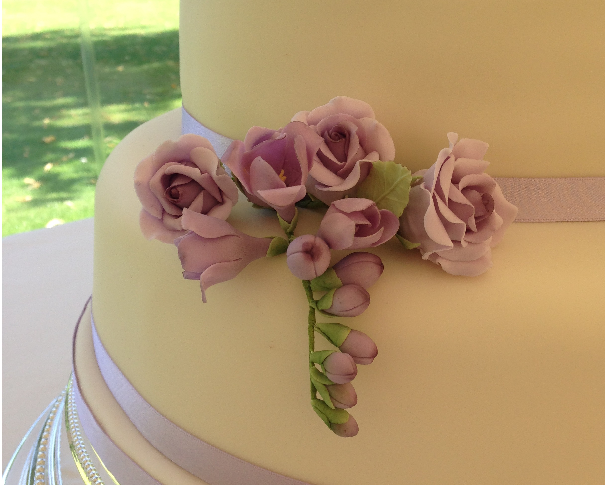This is now one of my favourite cakes – I love the simplicity of it and the way the freesias fall off the side. Emma had only specified the type of flowers and colour. My initial plan was to do a couple of roses and a stem of freesias curling round each tier, alternating sides up the cake. However, after making the freesias and experimenting with arranging the sugar paste flowers on cake tins, I decided that draping over the edge looked much better. Setting it up on cake tins also helped Becky know how to arrange the flowers when she got it to the venue – she arranged them perfectly!