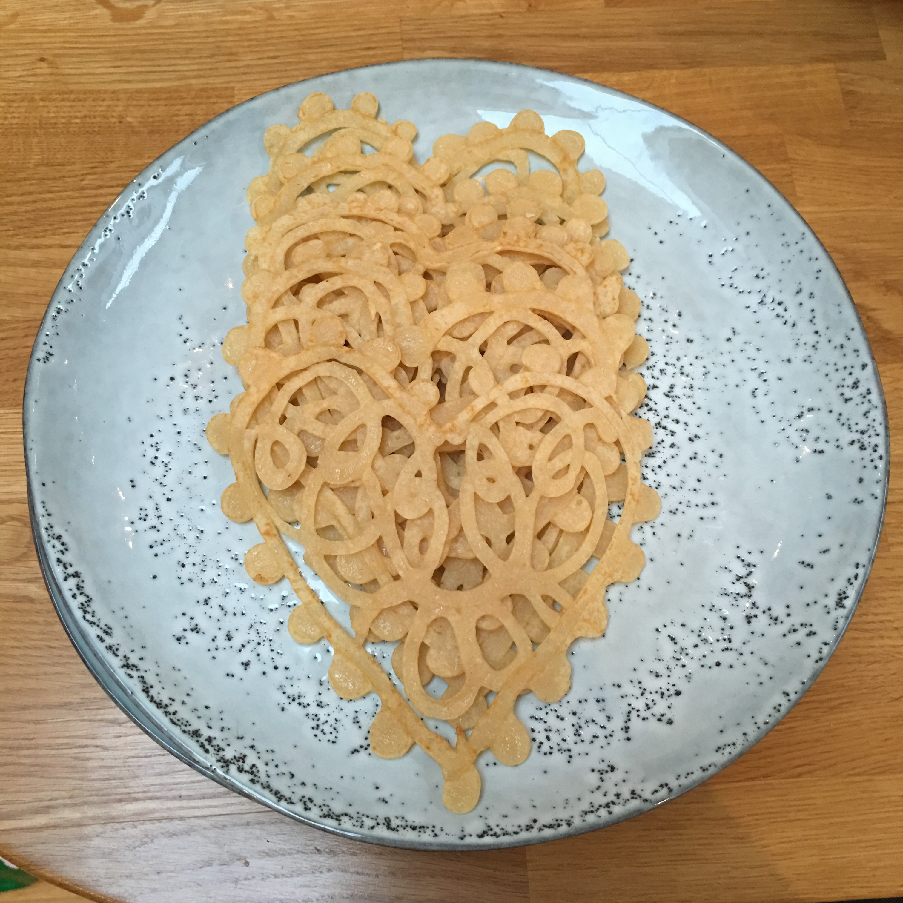 In the end I made 16 and decided to try a few different patterns out. Some of them ended up looking a bit messy, probably due to the mixture being a bit runny and using a piping bag rather than a squeezy bottle. These are a bit more time consuming than just making normal pancakes but I’m already looking forward to having them for pudding later!
