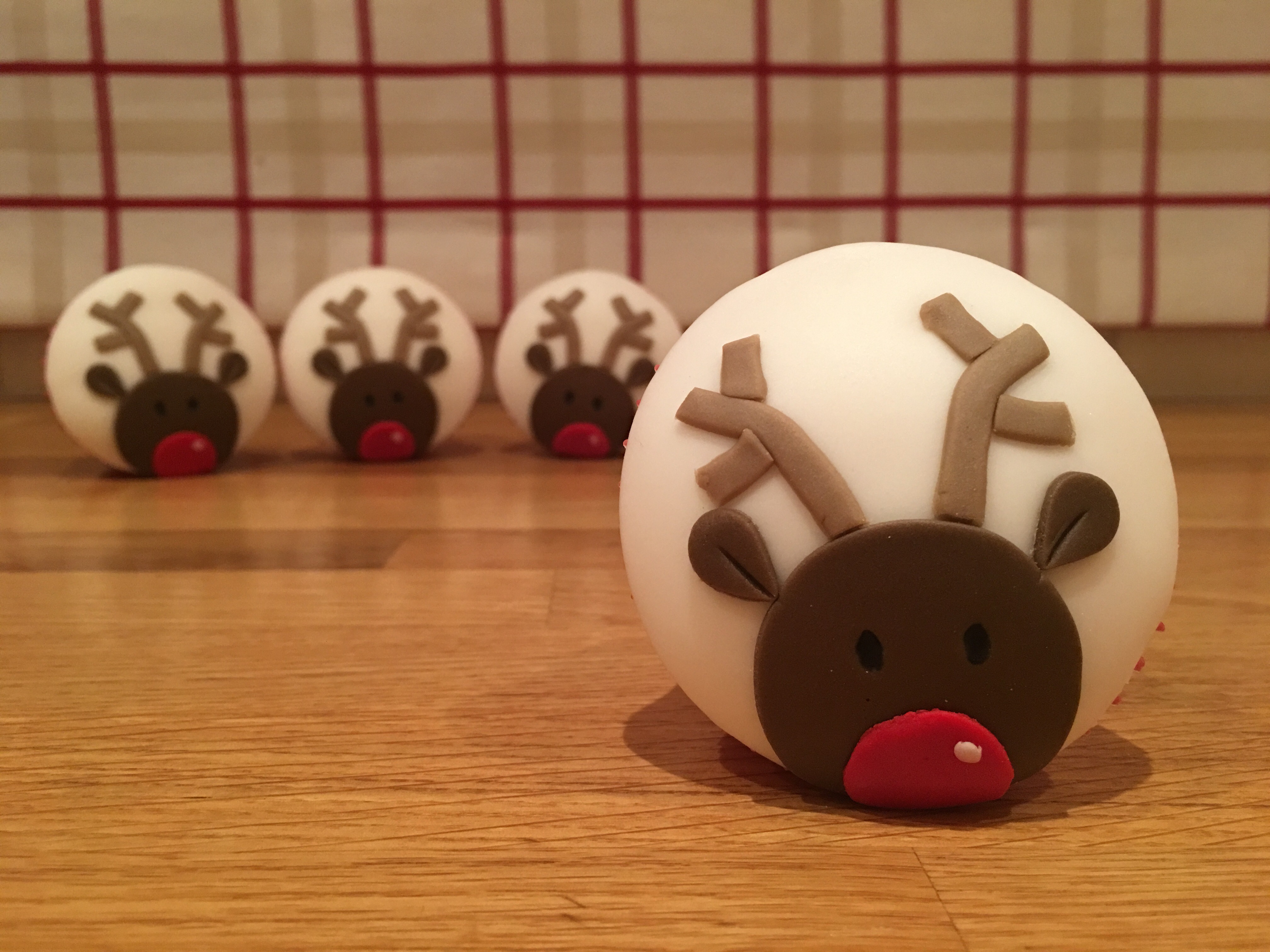 The reindeer heads were made from dark brown icing (you can roll this as thin as you can get it) – I cut out a circle and then used the same cutter I used for the white icing to cut the bottom off so that it fitted to the edge of the cake. The red nose was done in the same way but with a smaller circle cutter. The ears were cut out of brown icing using a tiny petal cutter and pushed a knife down the middle of them when I stuck them to the cake to create a line. The antlers were made from strips of pale brown icing. Finally I pressed a small dot of white icing onto the nose and drew the eyes on with a black edible pen.