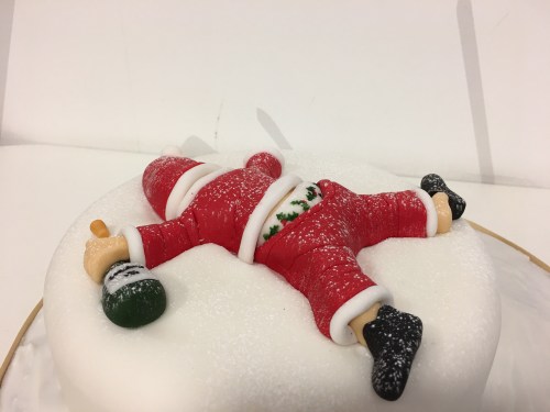 Luckily I found a design that was quick to make- a plain iced cake and I didn’t have to colour too much icing. I shaped Santa’s body, legs and hat separately and rolled out some ‘sausages’ of white icing to go round the edges for the fur trim. I then made his hands, feet, head and midriff out of skin coloured icing. His underpants were made from white icing and I painted the holly on. I then coloured a small amount of green icing for the bottle and black icing for his shoes.
