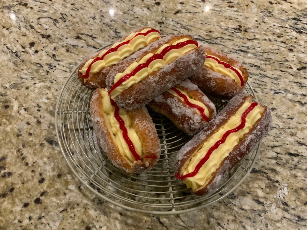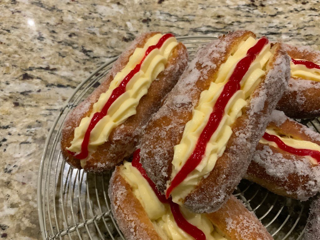 I fried the doughnuts while the girls were having their tea so we could all have them for pudding. I couldn’t believe how big they got when they were put into the hot oil! They had just enough time to cool down so I could pipe in the filling and the jam. We very much enjoyed eating them! Probably one of the best technical challenges ever, they were so good!