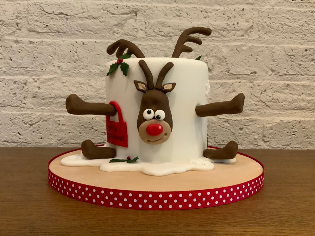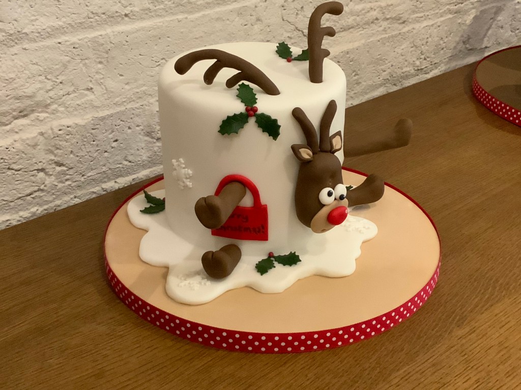 I made Rudolph using some brown sugar florist paste and each leg had a cocktail stick inserted into it so that when they had hardened they were easy to attach to the cake. I made the holly and snowflakes with more sugar florists paste and a holly and snowflake cutter.