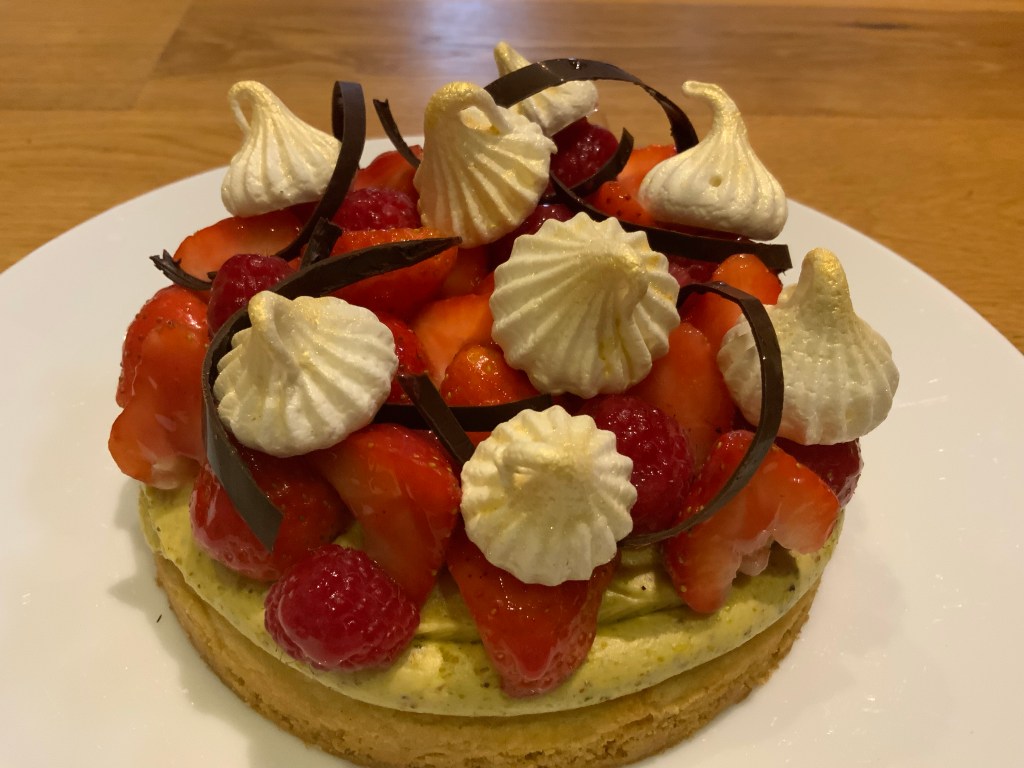 I made each bit separately when I had time on Friday and finished it off on Saturday morning. The hardest part was tempering the chocolate, I didn’t have a scraper so getting neat curls was tricky and my acetate was probably too thin and it had some big creases in so it didn’t roll into a cylinder very well. Despite the chocolate tempering, the recipe wasn’t too hard and made for a super delicious pudding!
