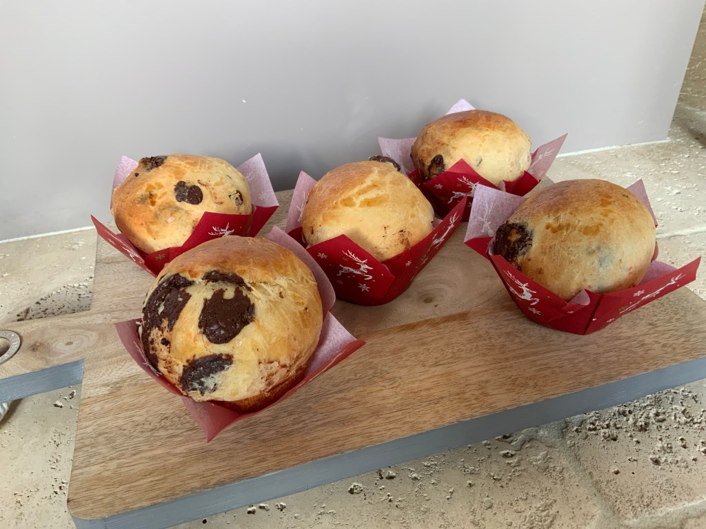 While the mixture is kneading, add the butter, a spoonful at a time, incorporating it into the dough. Tip in the wine-soaked fruit (with the excess juices) and chocolate, then mix briefly. The dough should be smooth and slightly wetter than a normal bread dough, but still roughly hold its shape. Add a little extra flour if it is still sloppy. Put the dough in a large, greased plastic container or bowl. Cover and leave to rise for 2-3 hours, or until at least doubled in size. Line each hole of a 12-hole muffin tin with a tulip case.