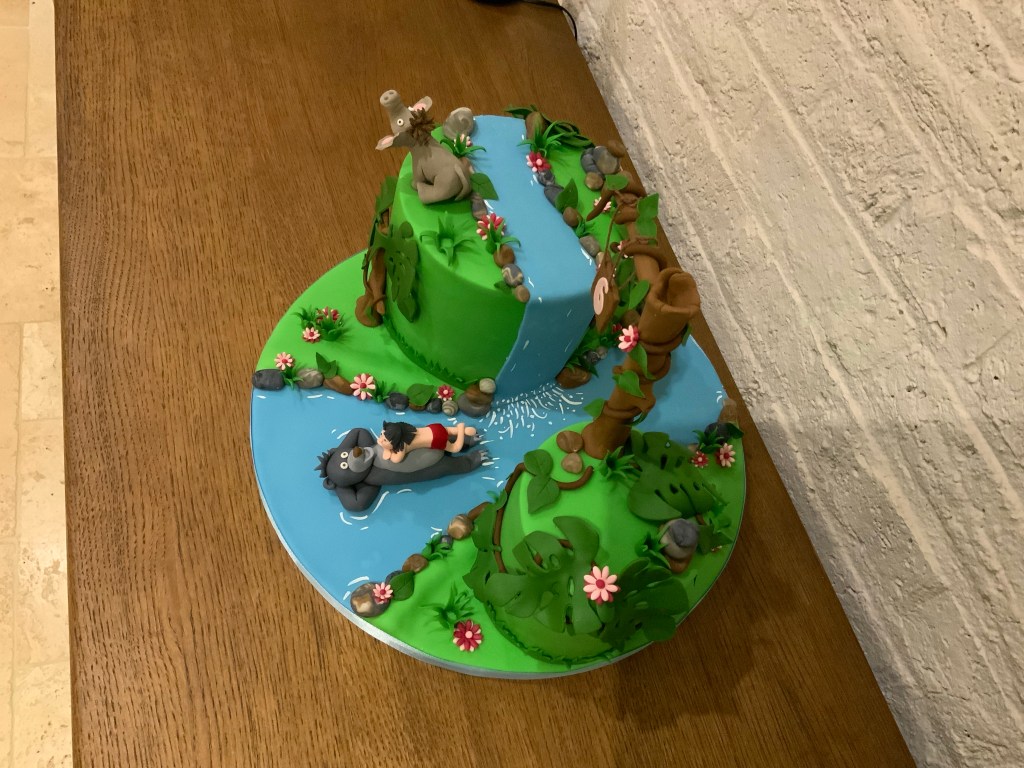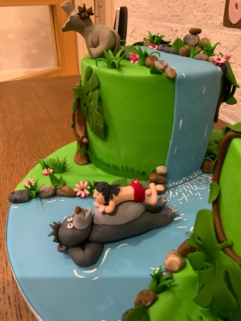 Over the summer we took the girls to see The Jungle Book at the open air theatre at Hever Castle, Emily absolutely loved it and decided she wanted a Jungle Book themed party for her 6th Birthday. So I set about designing a cake – she was quite specific about the things she wanted on the cake – a waterfall, a tree with the number 6 hanging off it, Mowgli, Baloo and the baby elephant. Click here to see what I created.